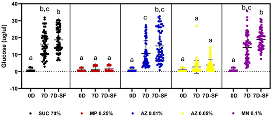 Stability of sucrose (70%, w/v) in sugar baits after one week of exposure to laboratory conditions in the presence of different stabilizers, compounds, or the presence of adult sand flies. The glucose concentration detected in each bait was used as a marker of degradation by hydrolysis. Traces and error bars correspond to the mean and standard deviation of three independent determinations with 10 baits each (n = 30). 0D—baits before incubation (0 days); 7D—baits after 7 days of incubation; 7D-SF—baits after 7 days of incubation in the presence of sand flies; SUC 70%—baits containing only 70% sucrose (w/v); MP 0.25%—baits containing 70% sucrose (w/v) added with 0.25% methylparaben (w/v); AZ 0.01% (w/v)—baits containing 70% (w/v) sucrose added with 0.01% (w/v) sodium azide; AZ 0.05%—baits containing 70% (w/v) sucrose added with 0.05% (w/v) sodium azide; MN 0.1%—baits containing 70% (w/v) sucrose added with 0.1% (w/v) mandelonitrile; Different letters indicate significantly different groups (p < 0.05, Kruskal–Wallis and Dunn’s test).