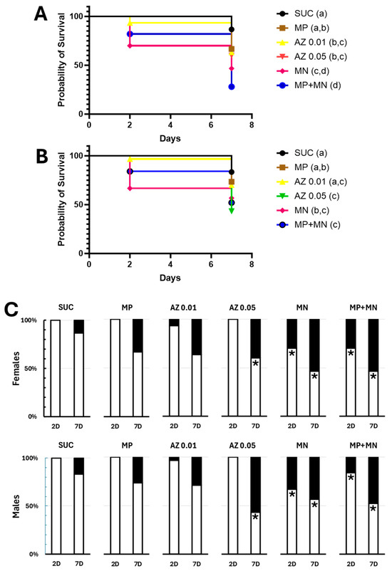 Effect of sugar baits containing different compounds on the survival of sand flies. (A) Survival curves of L. longipalpis females exposed to the baits for 7 days. (B) Survival curves of L. longipalpis males exposed to the baits for 7 days. (C) Percentage of live and dead sand flies after 2 or 7 days of exposure. Each cage contained 10 males and 10 females. SUC—baits containing only 70% (w/v) sucrose; MP—baits containing 70% (w/v) sucrose added with 0.25% (w/v) methylparaben; AZ 0.01—baits containing 70% (w/v) sucrose added with 0.01% (w/v) sodium azide; AZ 0.05—baits containing 70% (w/v) sucrose added with 0.05% (w/v) sodium azide; MN—baits containing 70% (w/v) sucrose added with 0.1% (w/v) mandelonitrile; MP+MN—baits containing 70% (w/v) sucrose added with 0.25% (w/v) methylparaben and 0.1% (w/v) mandelonitrile; 2D—2 days of exposure; 7D—7 days of exposure. White bars correspond to the percentage of live insects, and black bars correspond to the percentage of dead insects. In (A,B), different letters (a–d) indicate significantly different groups (p < 0.05, Log-rank test). In (C), asterisks indicate significantly different ratios of dead to live insects when compared to the SUC group, with the same incubation time, 2 or 7 days (p < 0.05, Fisher’s exact test).