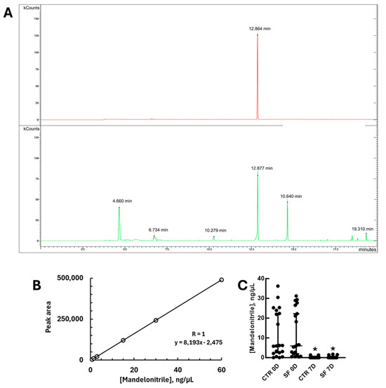Quantification of mandelonitrile by gas chromatography. (A) Chromatograms illustrating the detection profiles of samples after derivatization with MSTFA and GC analysis. Upper panel—mandelonitrile standard; Lower panel—sample from a freshly prepared sugar bait. kCounts—intensity of relative detection. (B) Standard curve of mandelonitrile of samples subjected to the acetonitrile precipitation procedure followed by derivatization with MSTFA. (C) Quantification of mandelonitrile in sugar baits before and after incubation for 7 days, in the absence or presence of sandflies in the cages. CTR 0D—baits before incubation (0 days) in the absence of sandflies; SF 0D—baits before incubation (0 days) in the presence of sandflies; CTR 7D—baits after 7 days of incubation in the absence of sandflies; SF 7D—baits after 7 days of incubation in the presence of sandflies. In (C), asterisks indicate significantly different concentrations when compared to baits before incubation, in the absence or presence of sand flies (p < 0.05, Mann–Whitney test).