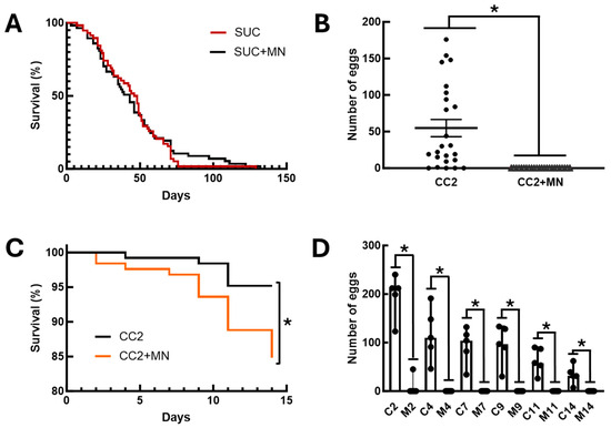 Effects of mandelonitrile on the non-target organism, the fly D. melanogaster. (A) Survival curves of adults (male and female) exposed to sugar baits placed inside the cage. SUC—baits with 70% (w/v) sucrose solution; SUC+MN—70% (w/v) sucrose baits containing 0.1% (w/v) mandelonitrile. (B) Number of eggs laid by adult D. melanogaster females in a free-choice experiment between two oviposition and larval development media. CC2—control nutrient medium CC2 for maintaining D. melanogaster larvae; CC2+MN—CC2 medium containing 0.08% (w/w) mandelonitrile. (C) Survival curves of adult D. melanogaster females during forced exposure to CC2 or CC2+MN oviposition media. See Methods for composition. (D) Number of eggs laid over time in the experiment of forced exposure to CC2 or CC2+MN media. C2, C4, C7, C9, C11, and C14—number of eggs laid after 2, 4, 7, 9, 11, and 14 days of exposure to CC2 medium, respectively; M2, M4, M7, M9, M11, and M14—number of eggs laid after 2, 4, 7, 9, 11, and 14 days of exposure to CC2+MN medium, respectively. In (B), the asterisk indicates significantly different numbers of eggs in the comparison between groups (p < 0.05, Mann–Whitney test). In (C), the asterisk indicates significantly different survival curves (p < 0.05, Log-rank test). In (D), the asterisk indicates significantly different numbers of eggs in the comparison between the control (C) and mandelonitrile (M) groups, with the same incubation time, 2 to 14 days (p < 0.05, Mann–Whitney test).