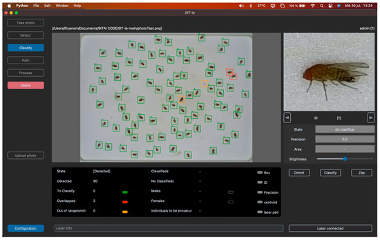 The core software component is a Python application allowing operators to manage the entire process, from image capture to laser treatment. This graphical user interface (GUI) was designed for intuitive and efficient interactions. The application has password-protected access. Once authenticated, users are directed to the main screen, where they can begin operating the system. The left panel guides users through each stage of the insect classification process, from image capture to laser elimination of non-useful targeted specimens. In addition to the main screen, a configuration screen allows users to adjust various parameters (i.e., colors). A magnifying tool enables detailed inspection of insects for verification. In normal operation, the process begins with an image capture, reviewed by the user. If the image is suitable, the detection proceeds; otherwise, a new image is captured. During detection, insects ready for classification are marked green, while overlapping or out-of-threshold insects are marked in red or orange, respectively. Users can manually label undetected insects (Figure 1).