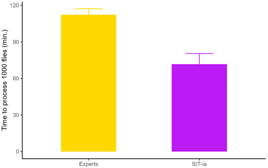 Time expended by experts and the SIT-ia for sex-sorting 1000 flies (including preparation time and sex separation). The orange bar shows the experts’ mean time required to analyze 1000 flies and the purple bar depicts SIT-ia performance. Error bars are the standard error (Wilcoxon test, W = 250, p-value = 0.0002).