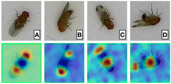 Heat maps generated using the RISE technique (Randomized Input Sampling for Explanation of Black-box Models). Panels (A–D) display distinct D. suzukii specimens, illustrating variations in the model’s attention patterns across different examples. Panels (A,B) are females, while (C,D) are males.