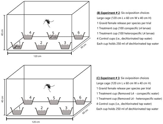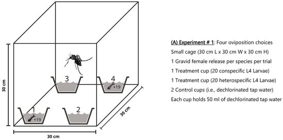We set up our first oviposition experiment inside standard Bioquip 30 cm L × 30 cm W × 30 cm H entomological cages (Figure 1A) (Bioquip products Inc., Compton, CA, USA). We establish four oviposition choices, including two treatments, and two controls within each experiment replicate. Treatments contained 20 L4-instar larvae of either Ae. aegypti or Ae. albopictus, each in disposable cardboard cups holding 50 mL of pre-filtered dechlorinated tap water, while the controls hold only 50 mL of pre-filtered dechlorinated tap water. Oviposition water was filtered using an under-sink Multi-Stage Filtration System to remove both contaminants and bacteria. In order to further prevent bacteria from growing in the oviposition water, the L4 larvae of both species were rinsed three times in pre-filtered water and given an hour to defecate before the tests began. We also used disposable Pasteur pipettes and gloves to transfer larvae to treatment cups, and autoclaved all non-disposable equipment between replicates to avoid bacterial contamination []. The position of each container inside the trial cage was randomized by assigning four places representing the corners of the cage, separated roughly at equal distance from each other and from the center. This allowed for impartial positioning of conspecific L4-larvae, heterospecific L4-larvae, and controls at each experimental replicate.