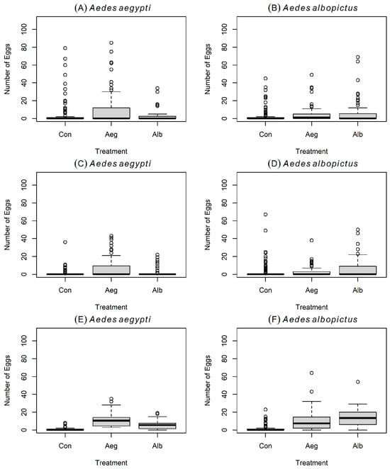 Boxplots (median and quantiles) of eggs laid by gravid Aedes spp. mosquitoes in the three experiments. Results of Experiment 1 (=small entomological cages with larvae) are shown for gravid Ae. aegypti and for gravid Ae. albopictus in (A,B) in that order. Results of Experiment 2 (=large entomological cages with larvae) are shown for gravid Ae. aegypti and for gravid Ae. albopictus in (C,D) in that order. Results of Experiment 3 (=large entomological cages without larvae) are shown for gravid Ae. aegypti and for gravid Ae. albopictus in (E,F) in that order.
