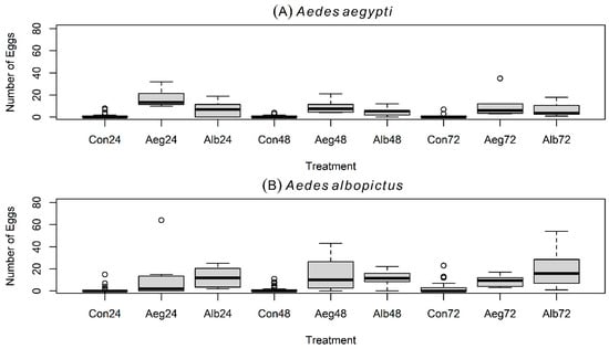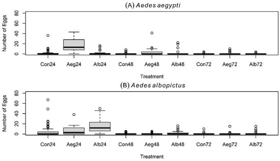 Boxplots (median and quantiles) of eggs laid by gravid Aedes spp. mosquitoes in experiment # 2. Results are shown for gravid females of Ae. aegypti (A) and Ae. albopictus (B) in large trial cages and with 6 oviposition choices in total: two treatments (i.e., 100 conspecific or 100 heterospecific larvae per treatment) and four controls (i.e., 4 oviposition cups containing only water). Con = Control at 24, 48, and 72 h; Aeg = Aedes aegypti at 24, 48, and 72 h; Alb = Aedes albopictus at 24, 48, and 72 h.