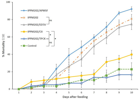 Locusta migratoria mortality after ingesting M. anisopliae conidia mixed with one of the four selected inhibitors or the control only. Statistical significance: Asterisks (*) indicate statistically significant differences compared to the control group (* p < 0.05), and “ns” indicates no significant difference (p ≥ 0.05).