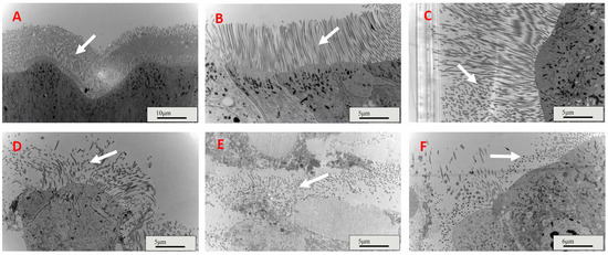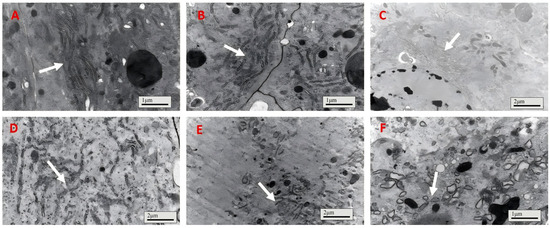 The endoplasmic reticulum of Locusta migratoria midgut four days after M. anisopliae ingestion, where (A) control; (B) IPPM202/TPCK; (C) IPPM202/CI1; (D) IPPM202; (E) IPPM202/APMSF; (F) IPPM202/EDTA. Note: white arrows the endoplasmic reticulum under different treatments.