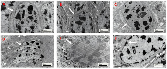 Cell membranes of locust midgut membrane cells four days after ingestion of M. anisopliae: (A) control; (B) IPPM202/TPCK; (C) IPPM202/CI1; (D) IPPM202; (E) IPPM202/APMSF; (F) IPPM202/EDTA. Note: white arrows represent the nucleus membrane under different treatments.