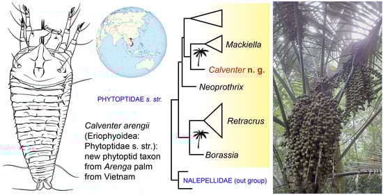 Chetverikov, P.E. A New Genus of Four-Legged Mites from Palms in Vietnam: The Morphology and Phylogeny of Calventer arengii n. g. & sp. (Eriophyoidea, Phytoptidae). Insects 2025, 16, 1113. https://doi.org/10.3390/insects16111113