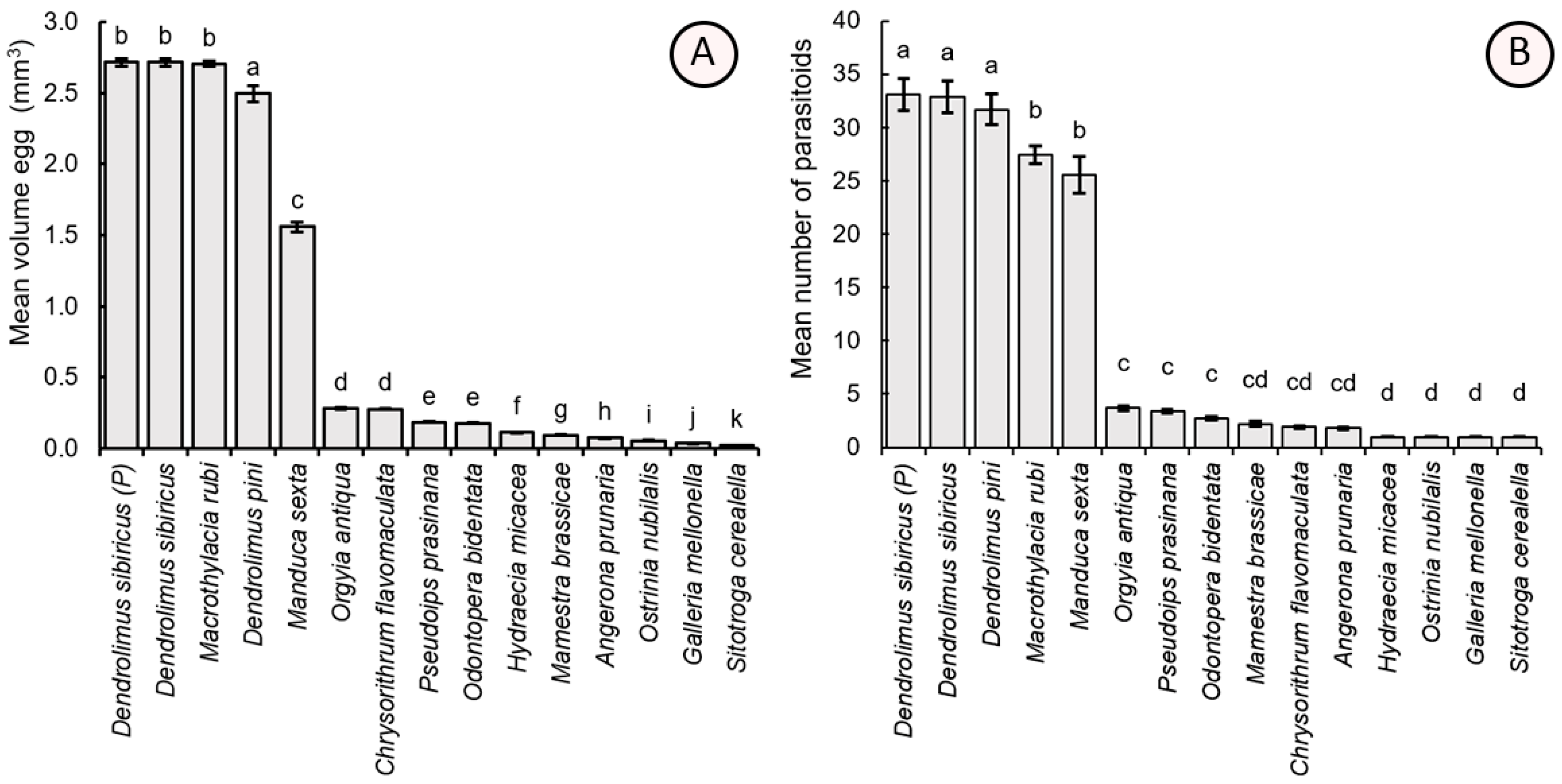 - Kirichenko, N.I.; Ageev, A.A.; Astapenko, S.A.; Golovina, A.N.; Kasparyan, D.R.; Kosheleva, O.V.; Timokhov, A.V.; Tselikh, E.V.; Zakharov, E.V.; Musolin, D.L.; et al. The diversity of parasitoids and their role in the control of the Siberian moth, Dendrolimus sibiricus (Lepidoptera: Lasiocampidae), a major coniferous pest in Northern Asia. Life 2024, 14, 268. [Google Scholar] [CrossRef]