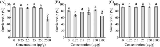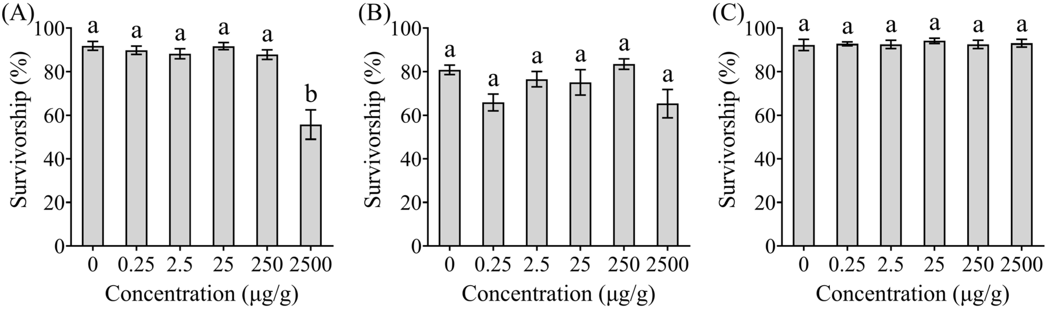 No significant differences in survivorship were observed between termites exposed to ethyl 2, 4-dioxovalerate (χ2 = 15.25; df = 5; p = 0.0094; Figure 1B) or diglycolic acid (χ2 = 1.65, df = 5, p = 0.8953; Figure 1C) compared to the control group, but termites exposed to phenol at 2500 μg/g exhibited significantly reduced survival rates (χ2 = 27.64, df = 5, p < 0.0001; Figure 1A).