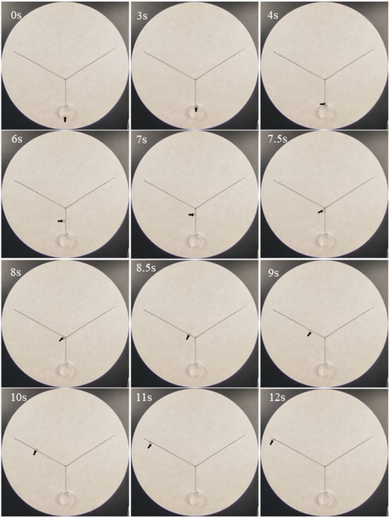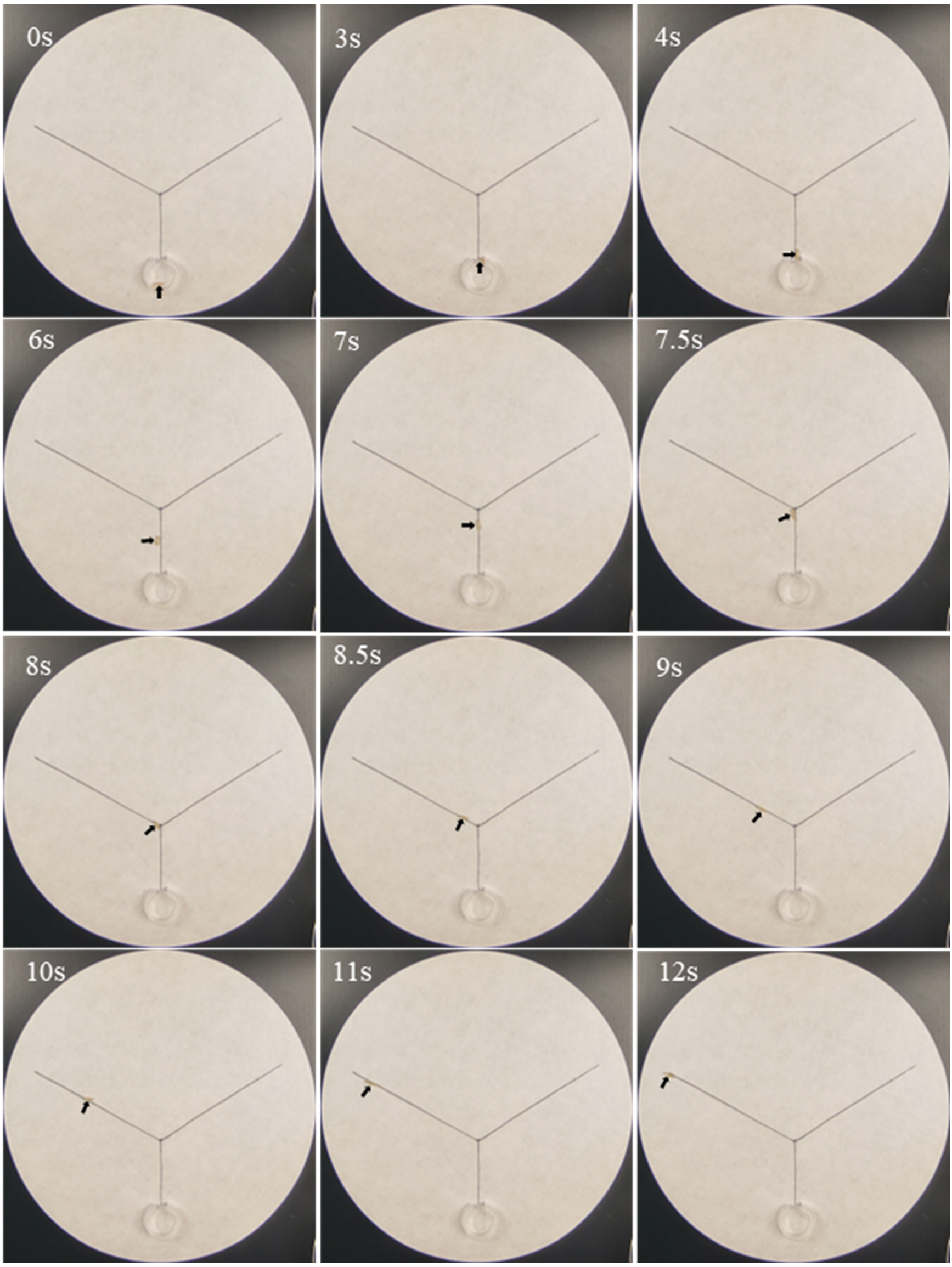 Examples of trail-following behavior of Coptotermes formosanus workers along paths treated with phenol (0.5 μg/cm), indicating strong trail-following activity at this concentration. In this example, the right branch was drawn with acetone as a control, whereas the left branches were drawn with phenol (the final concentration was 0.5 μg/cm). The arrows indicated the location of worker termites at different time points.