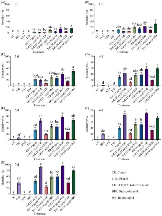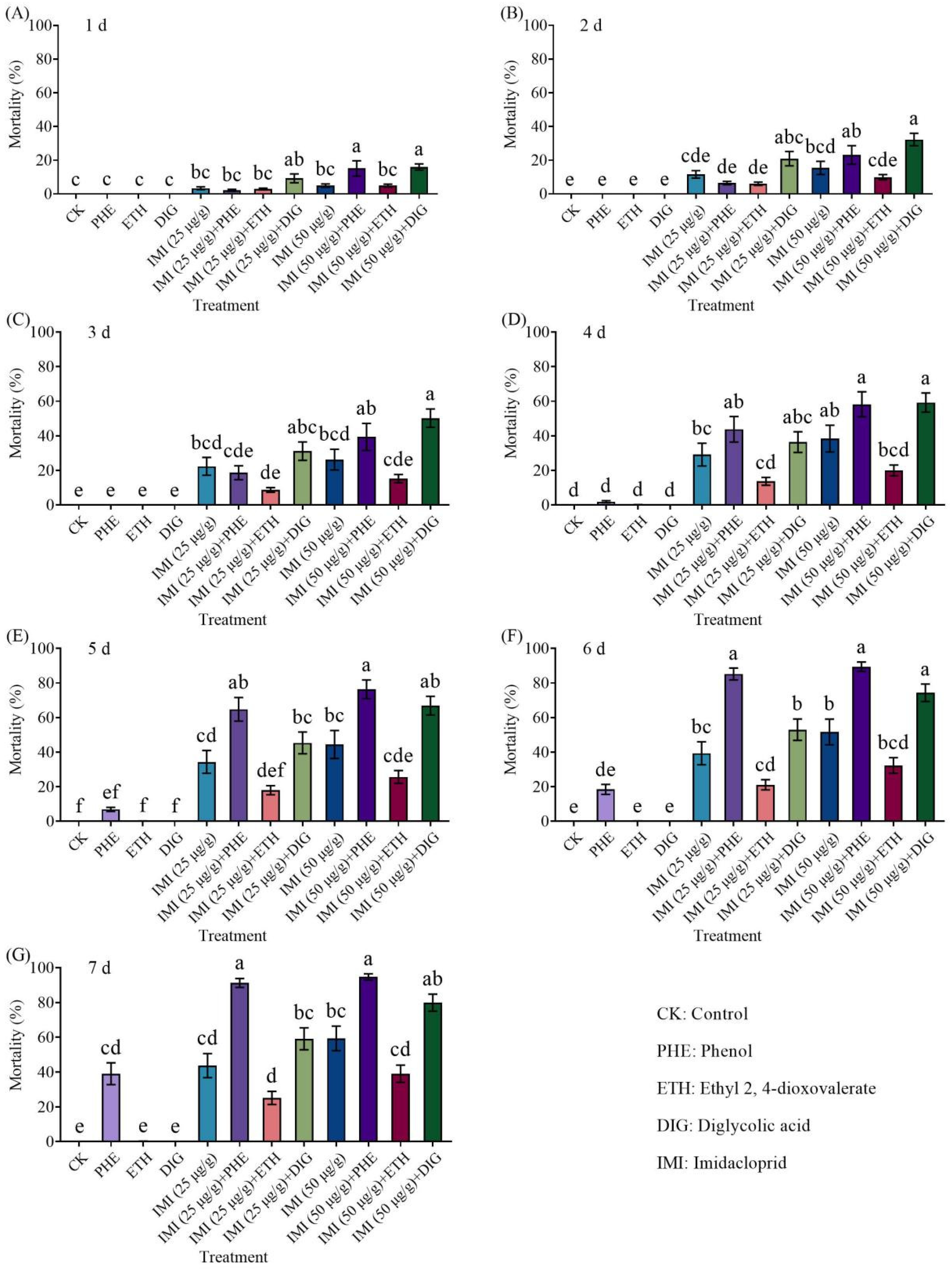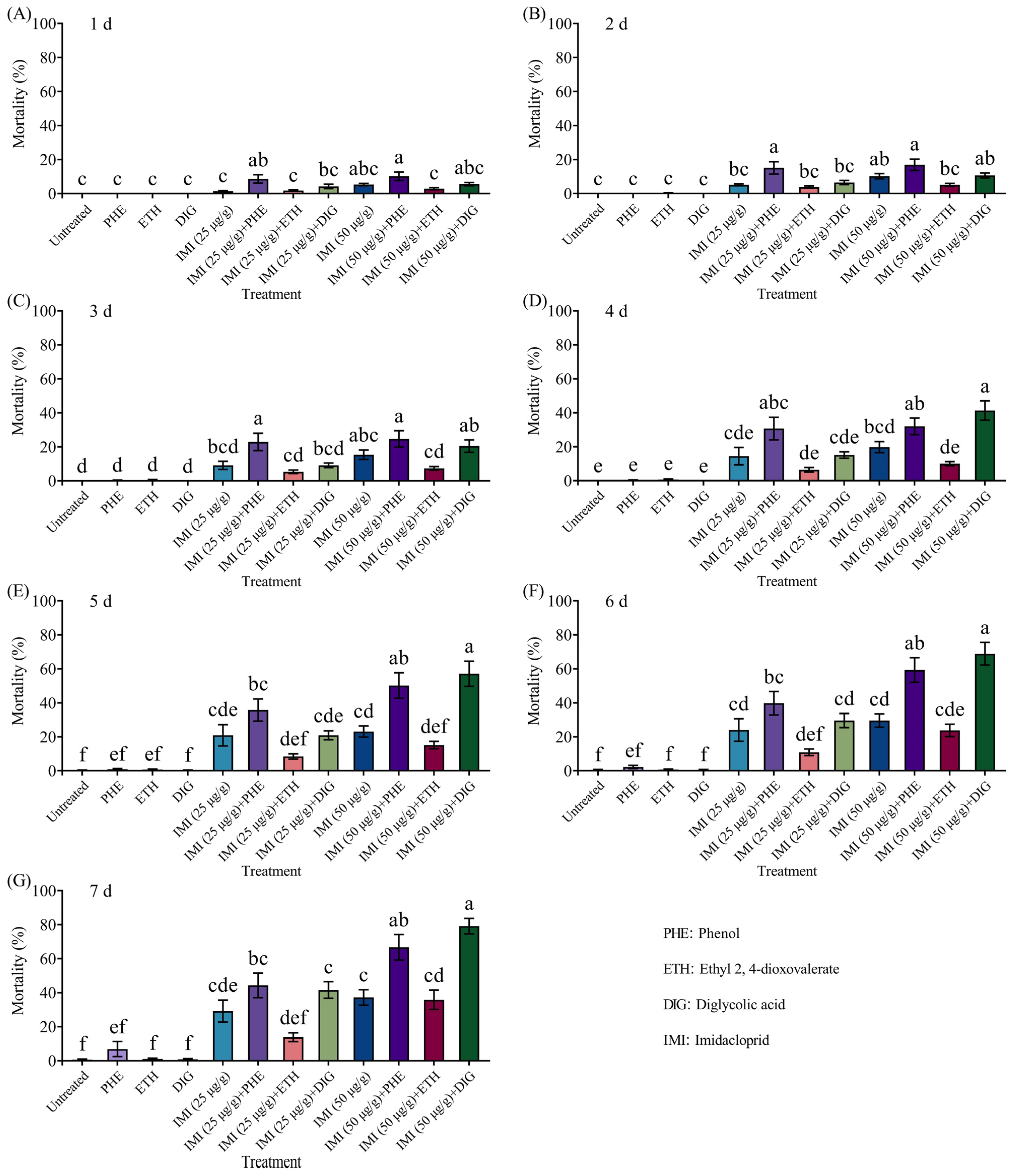Effect of the combined application of different compounds and imidacloprid on the mortality of Coptotermes formosanus at 1 d (A), 2 d (B), 3 d (C), 4 d (D), 5 d (E), 6 d (F), and 7 d (G). Data are presented as mean ± SE; different letters indicate significant differences (p < 0.05).
