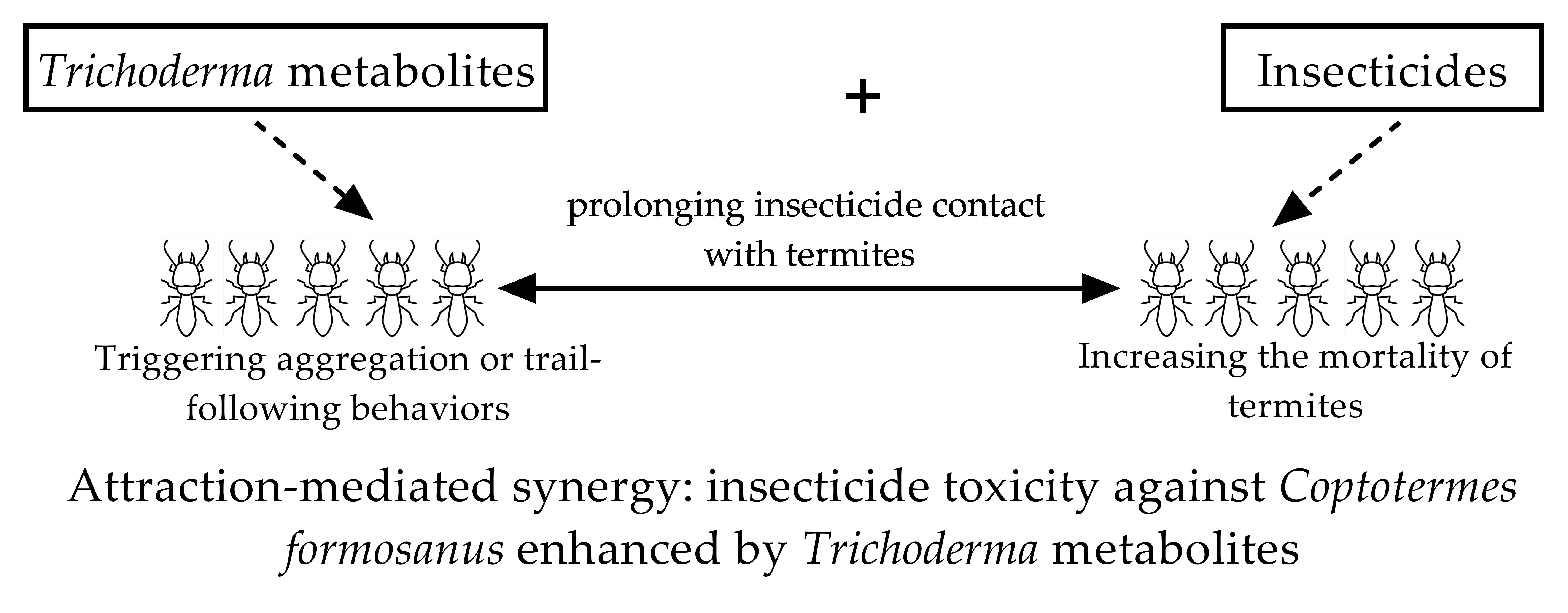 - Zhang, L.; Yi, C.; Du, C.; Wen, C.; Li, Z.; Chen, Y.; Wen, X.; Wang, C. Trichoderma metabolites trigger aggregation behavior in Formosan subterranean termites (Coptotermes formosanus). Insect Sci. 2023, 30, 1759–1772. [Google Scholar] [CrossRef]