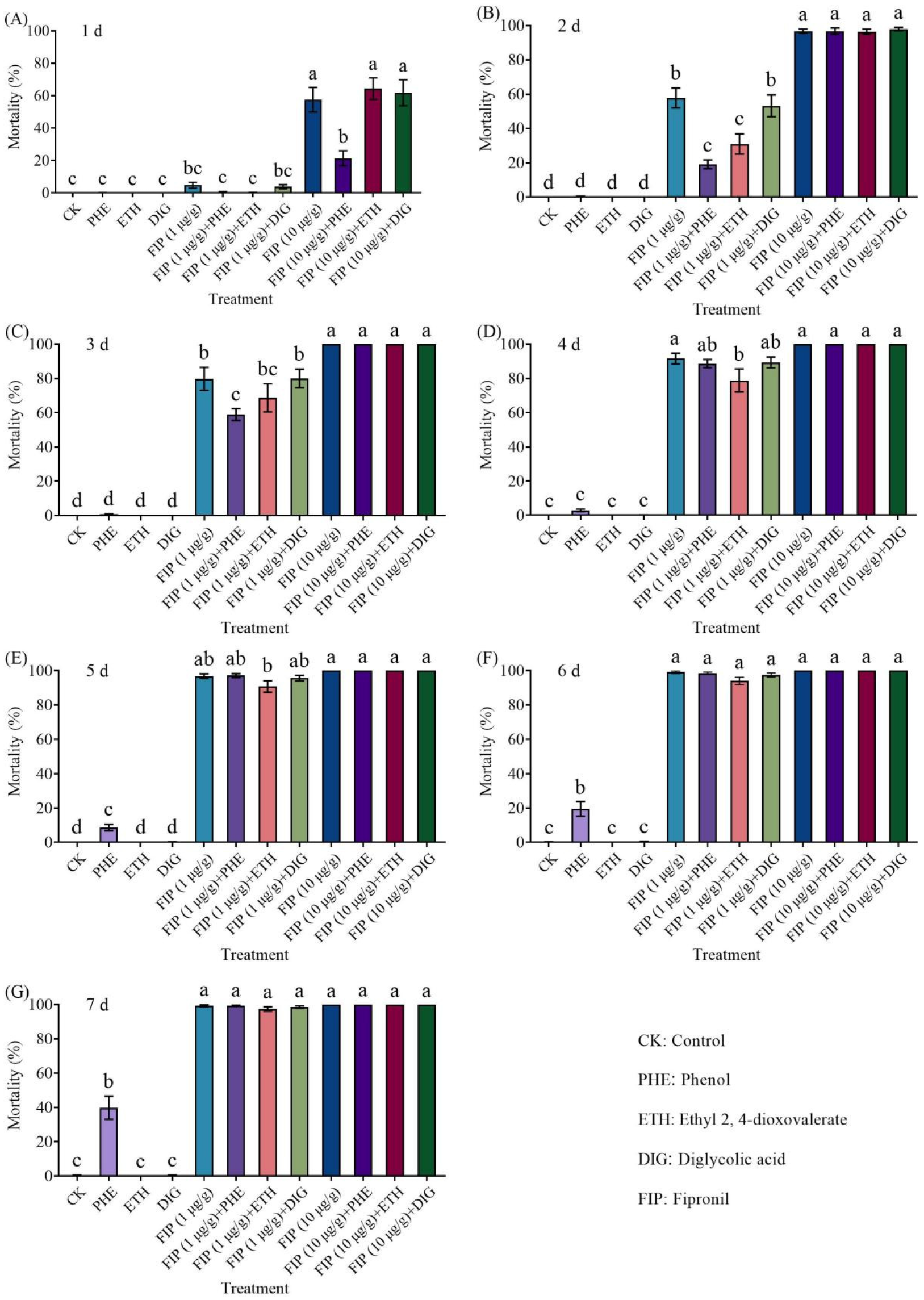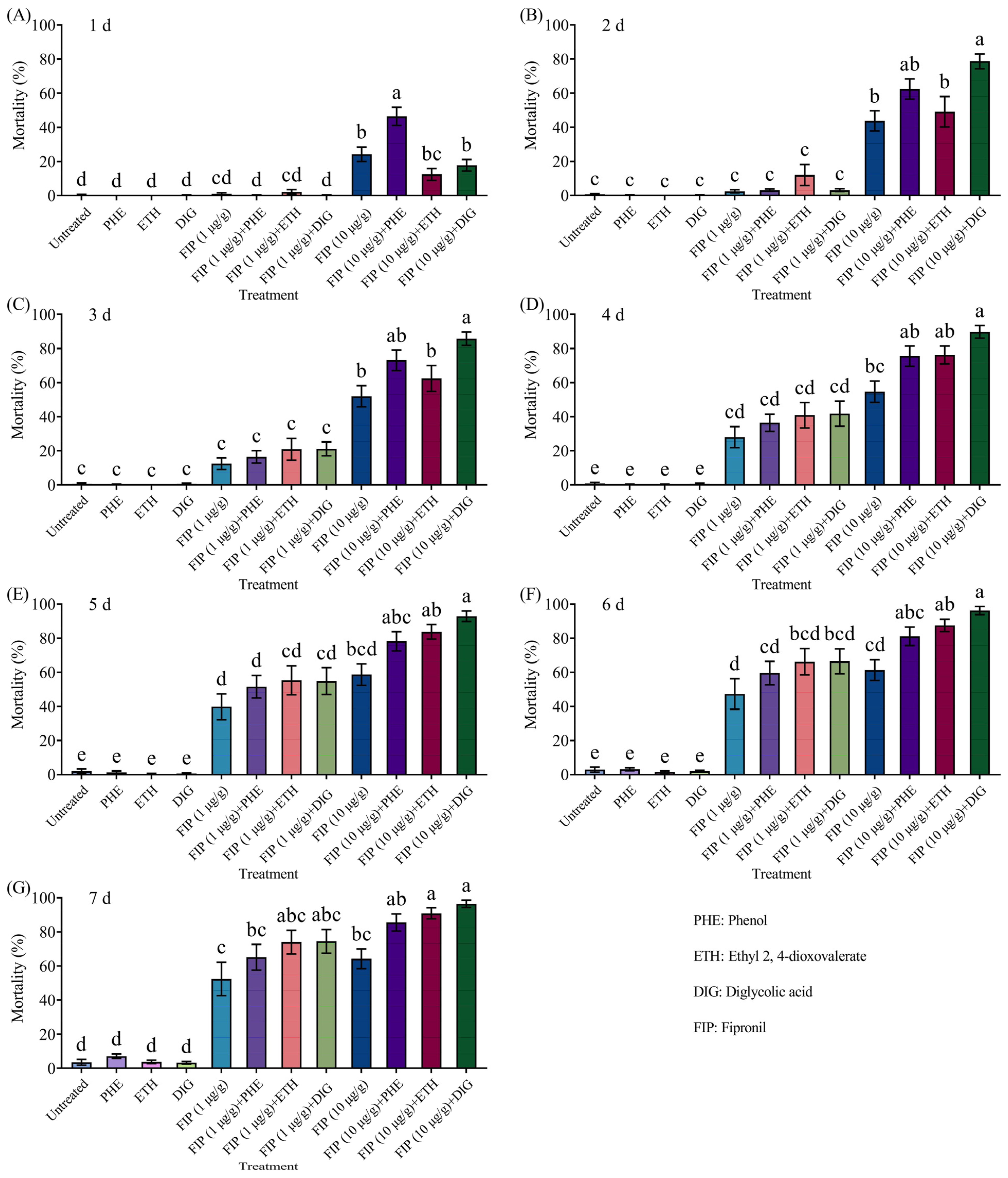 Effects of the combined application of different compounds and fipronil on the mortality of Coptotermes formosanus at 1 d (A), 2 d (B), 3 d (C), 4 d (D), 5 d (E), 6 d (F), and 7 d (G). Data are presented as mean ± SE; different letters indicate significant differences (p < 0.05).