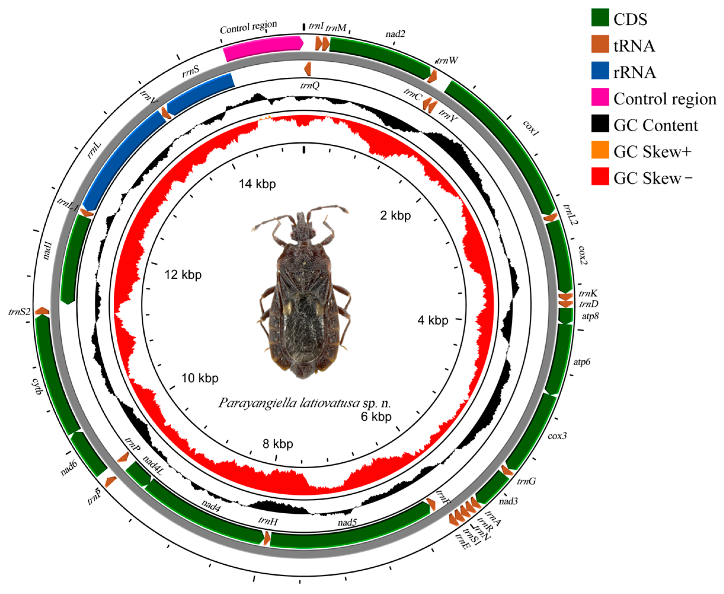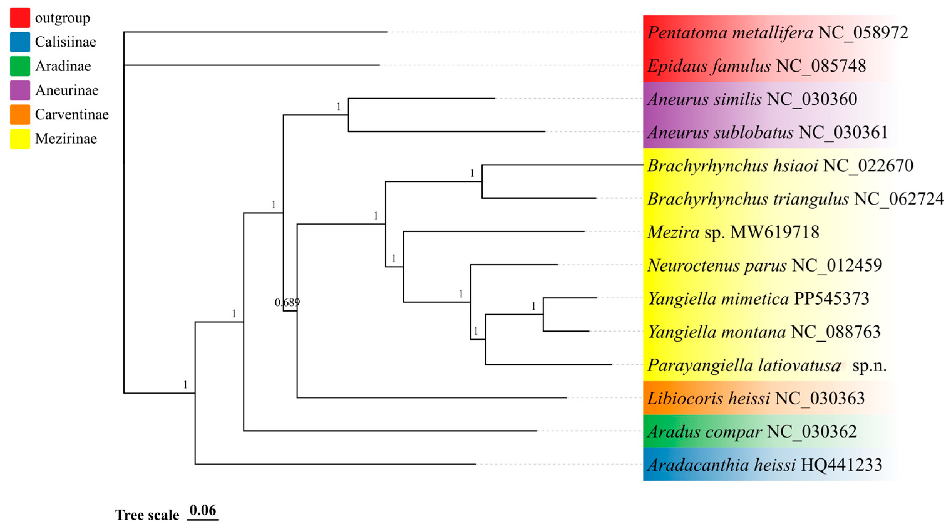 - Li, Y.R.; Ji, L.P.; Bai, X.S. Analysis of the mitochondrial genome of Neuroctenus hainanensis and the phylogenetic position of Aradoidea. Sci. Rep. 2025, 15, 9632. [Google Scholar] [CrossRef] [PubMed]