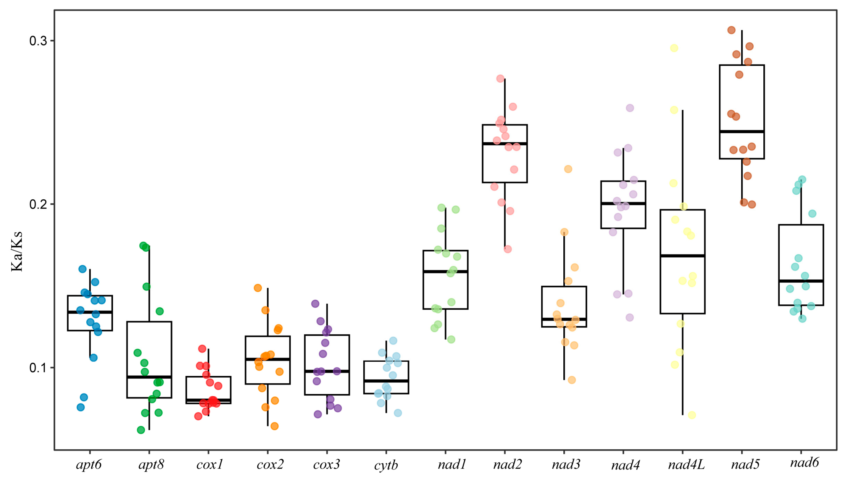 3.3.4. Ka/Ks Analysis of Protein-Coding Genes in Mitochondrial Genomes