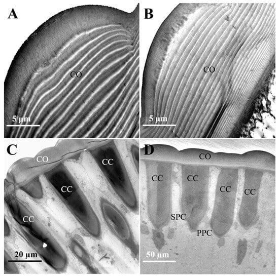 The cornea and crystalline cone in the distal ommatidial region of female and male L. xylina. (A) Longitudinal section of the cornea in the female. (B) Longitudinal section of the cornea in the male. (C) Longitudinal section of the crystalline cone in the female. (D) Longitudinal section of the crystalline cone in the male. CO: cornea; CC: crystalline cone; PPC: primary pigment cell; SPC: secondary pigment cell.