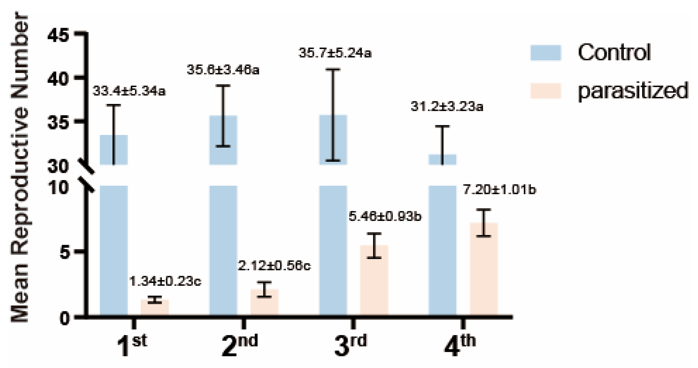 2.3. The Reproduction of A. gossypii in Response to the Parasitism by B. communis