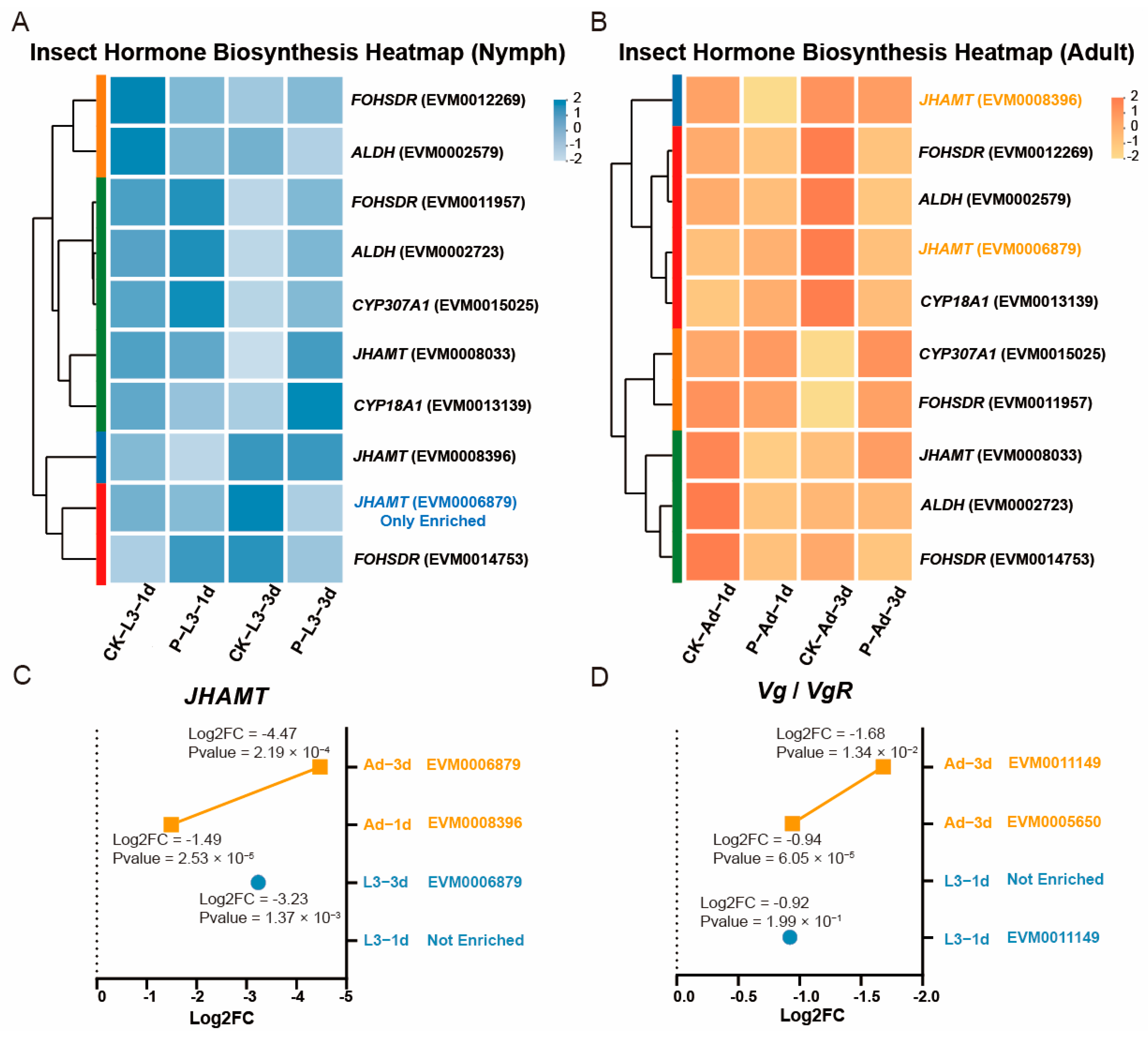 3.5. JHAMT-Centered Gene Regulation Underlies Parasitoid Host Preference