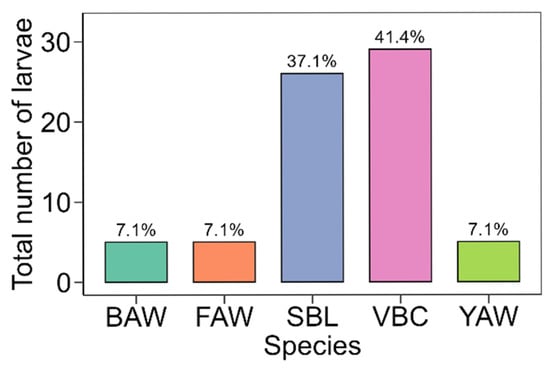 Total number of larvae collected in commercial peanut fields in the FL Panhandle, USA, using the beat cloth method. BAW—Spodoptera exigua, FAW—S. frugiperda, SBL—Chrysodeixis includens, VBC—Anticarsia gemmatalis, YAW—S. ornithogalli.