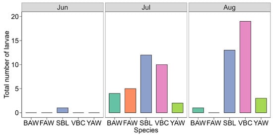 Total number of larvae collected in commercial peanut fields in the FL Panhandle, USA, over the crop season using the beat cloth method. BAW—Spodoptera exigua, FAW—S. frugiperda, SBL—Chrysodeixis includens, VBC—Anticarsia gemmatalis, YAW—S. ornithogalli.