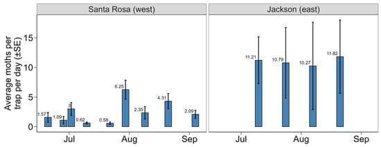 Average number of BAW moths per trap per day collected in pheromone traps on the west (Santa Rosa County) and east side (Jackson County) of the Florida Panhandle, USA. Bars represent the mean with standard error. Numbers above each bar represent the average number of moths.