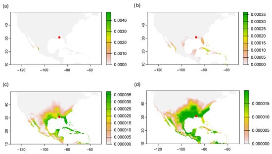 Probability of origin of BAW collected in the Florida Panhandle region, FL. USA, based on hydrogen isotope ratios (δ2H). Green represents higher probability of origin. Each map represents an example of the dispersal pattern of a single BAW moth specimen. Red dot represents where the moth was collected. Maps of the probability of origin of all samples are in Figures S1–S3.