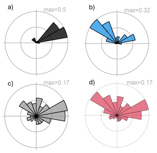 We identified four distinct patterns in the probability of origin for BAW when using hydrogen isotopes (Figure 4 and Figure S1–S3). The first pattern, observed in five samples (19.2% out of 26 samples), suggests a potential origin in the Gulf of California, northwestern Mexico, or the Caribbean region (Figure 4a). Rose diagram bars indicate movement from the southwest (Figure 5a and Figure S4), with an average distance of 2056 ± 52 km (mean ± SD) and an average bearing of 39 ± 15° (Table S1, Figure S5). The second pattern, represented by seven samples (26.9%), indicates a higher probability of origin in South Florida, the Caribbean, and the Gulf of California (Figure 4b and Figure S1–S3) compared to Pattern 1. The average bearing for the probability of origin is 350 ± 3°, suggesting potential movement from the south and southeast (Table S1, Figure S5), with an average distance of 1651 ± 100 km (Figure 5b and Figure S4).