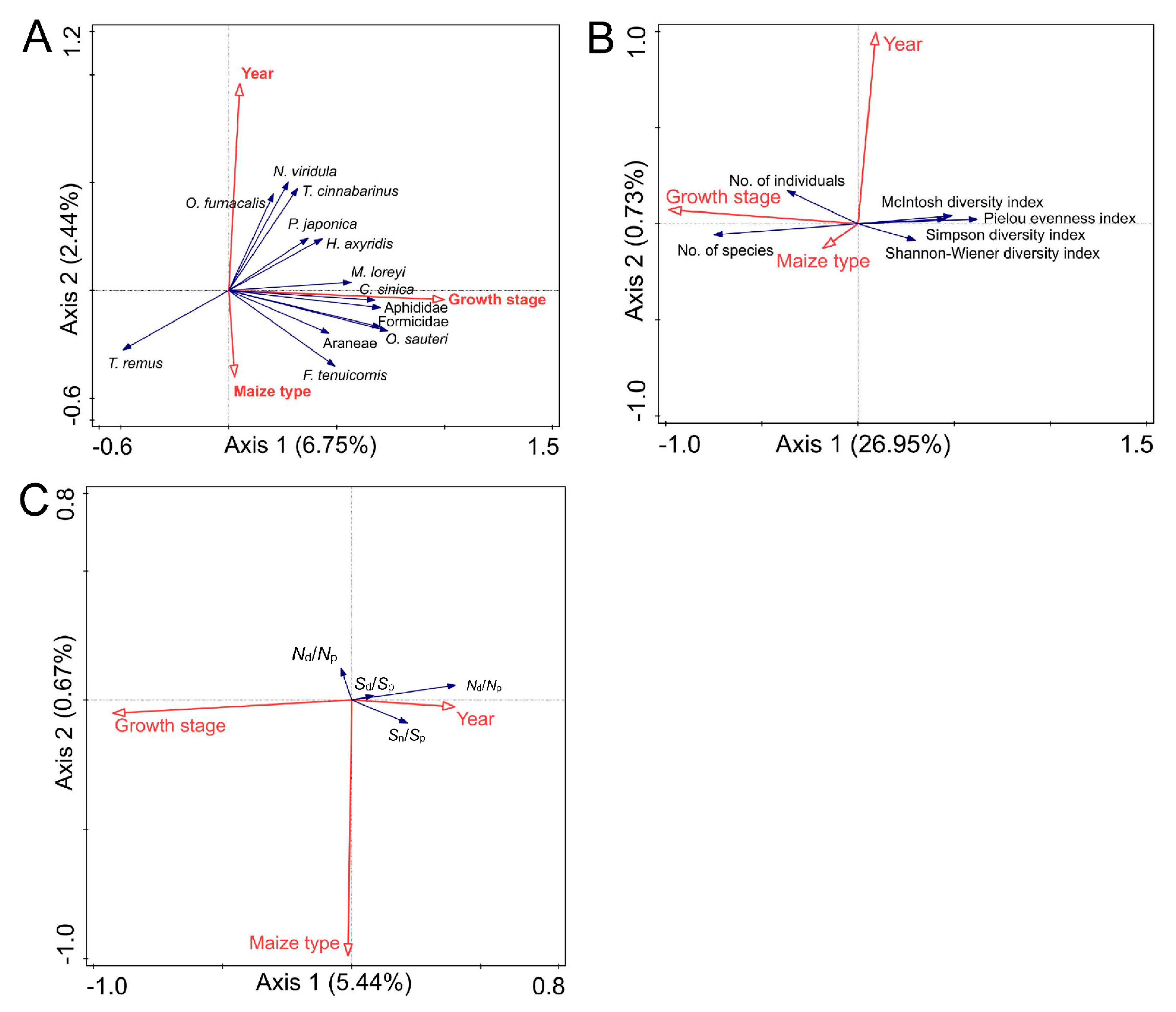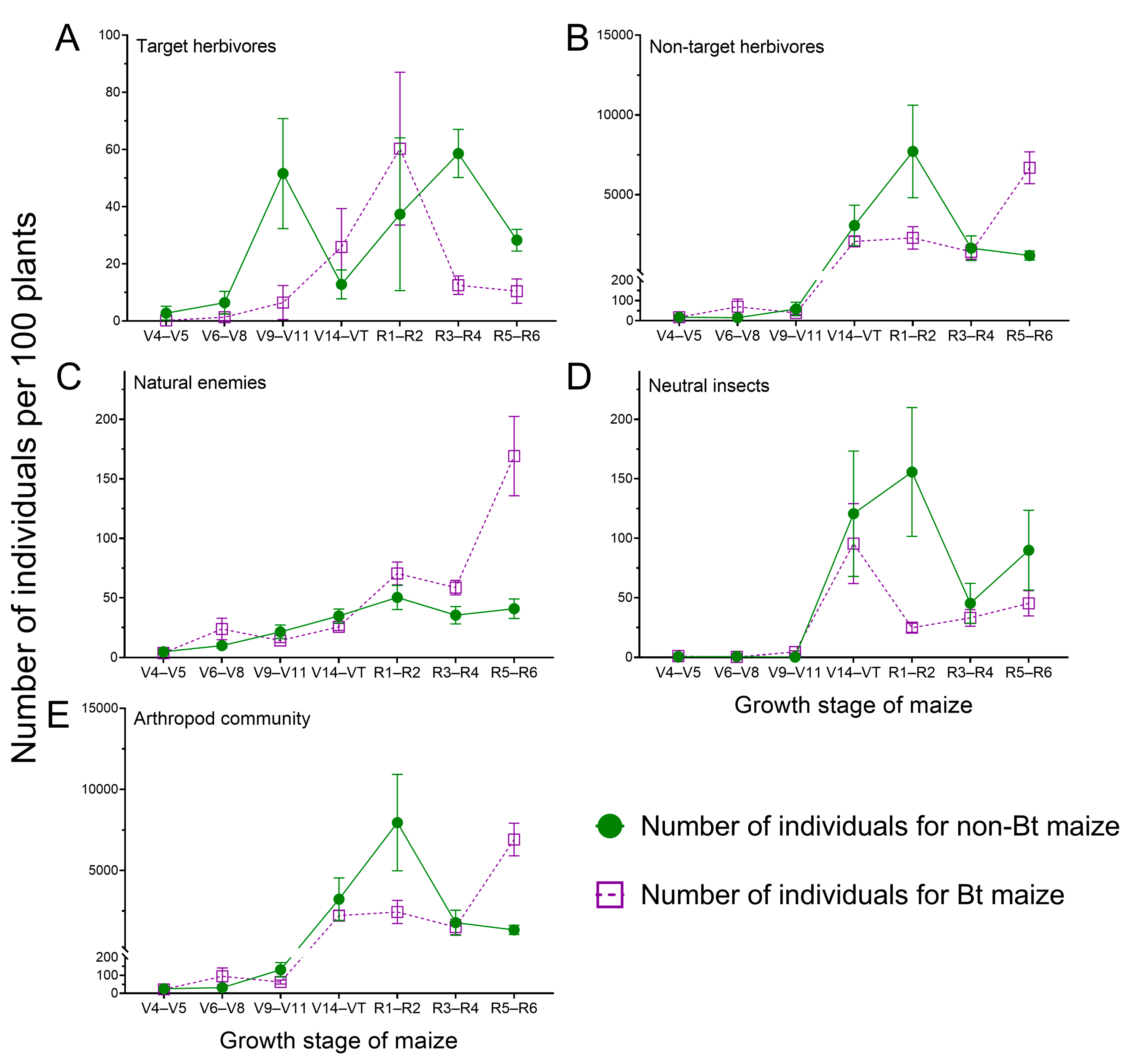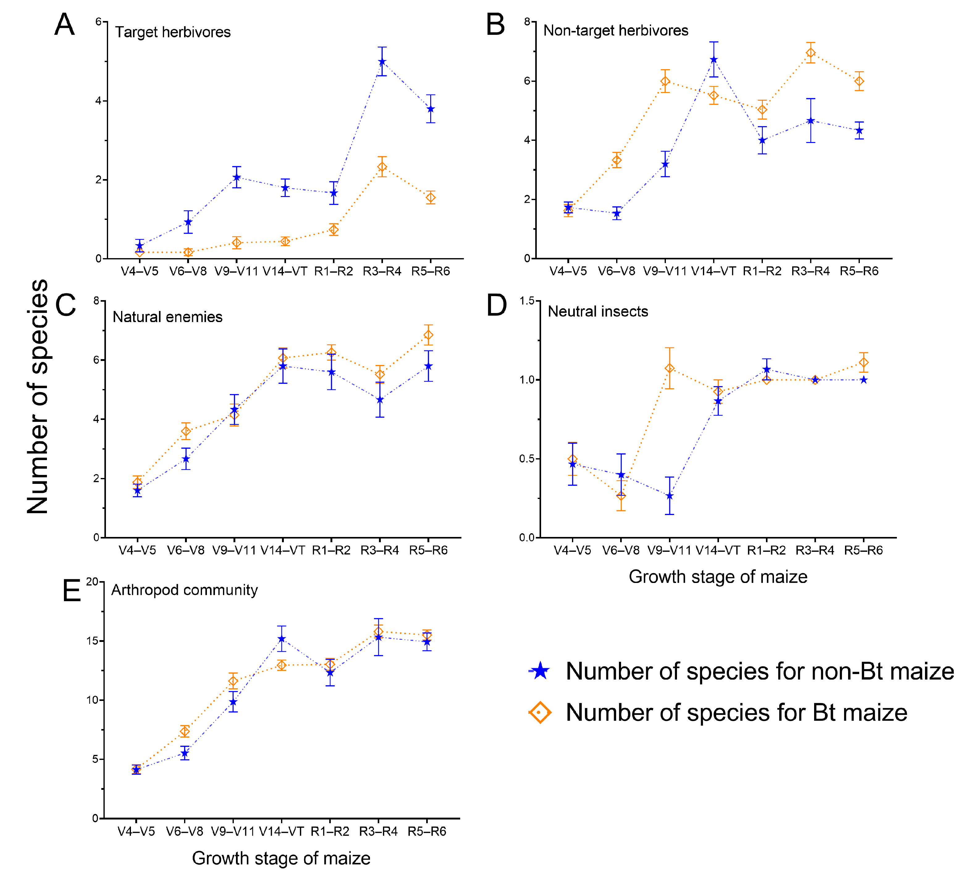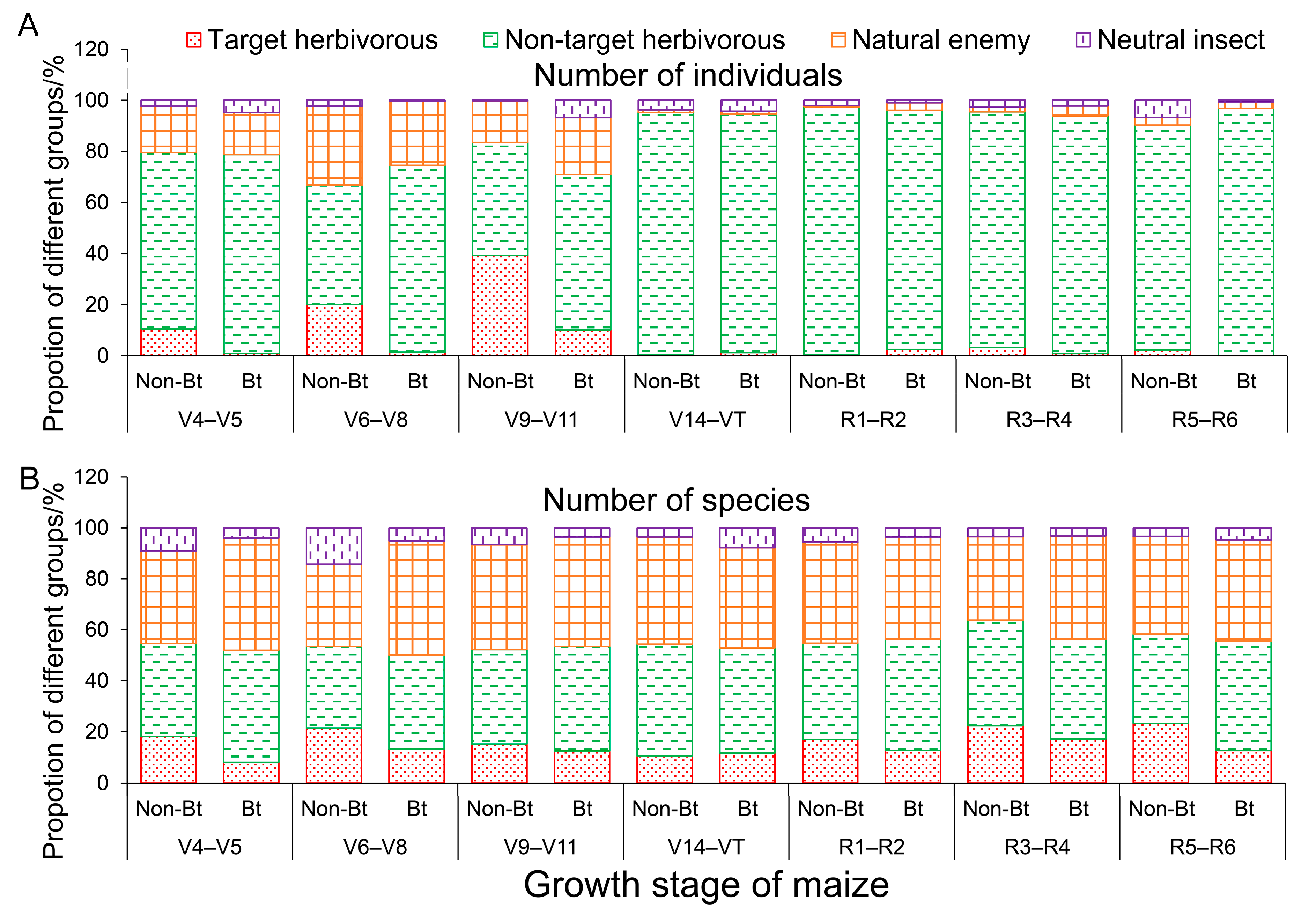 | Year | Growth Stage of Maize | Arthropod Community | Target Herbivores | Non-Target Herbivores | Natural Enemies | Neutral Insects |