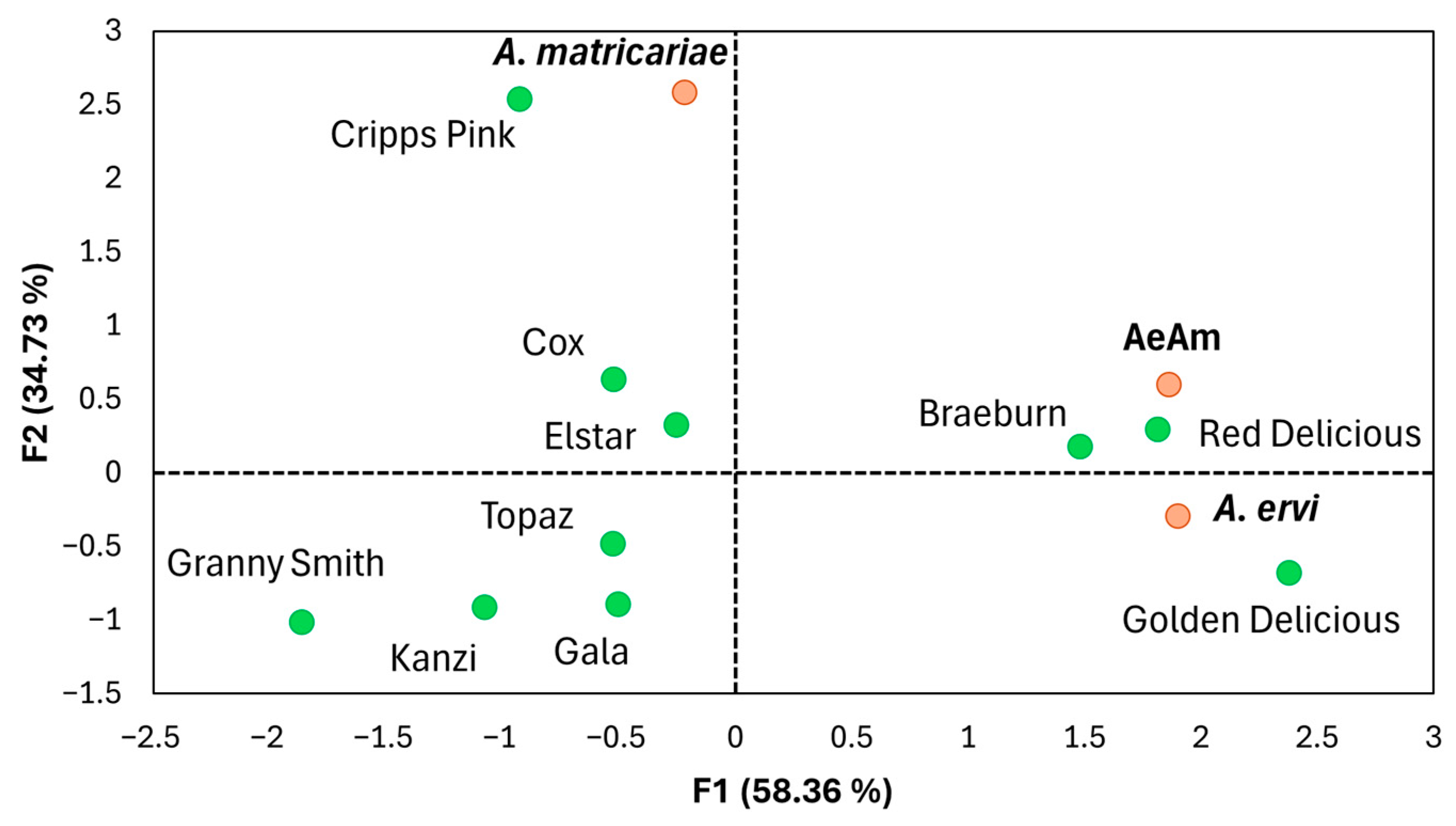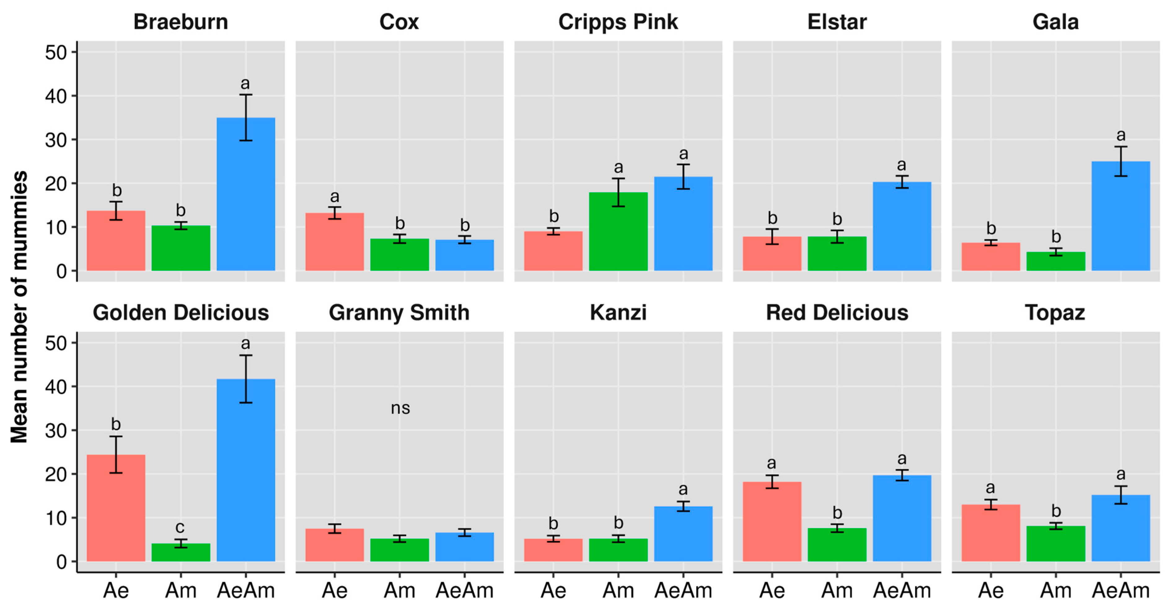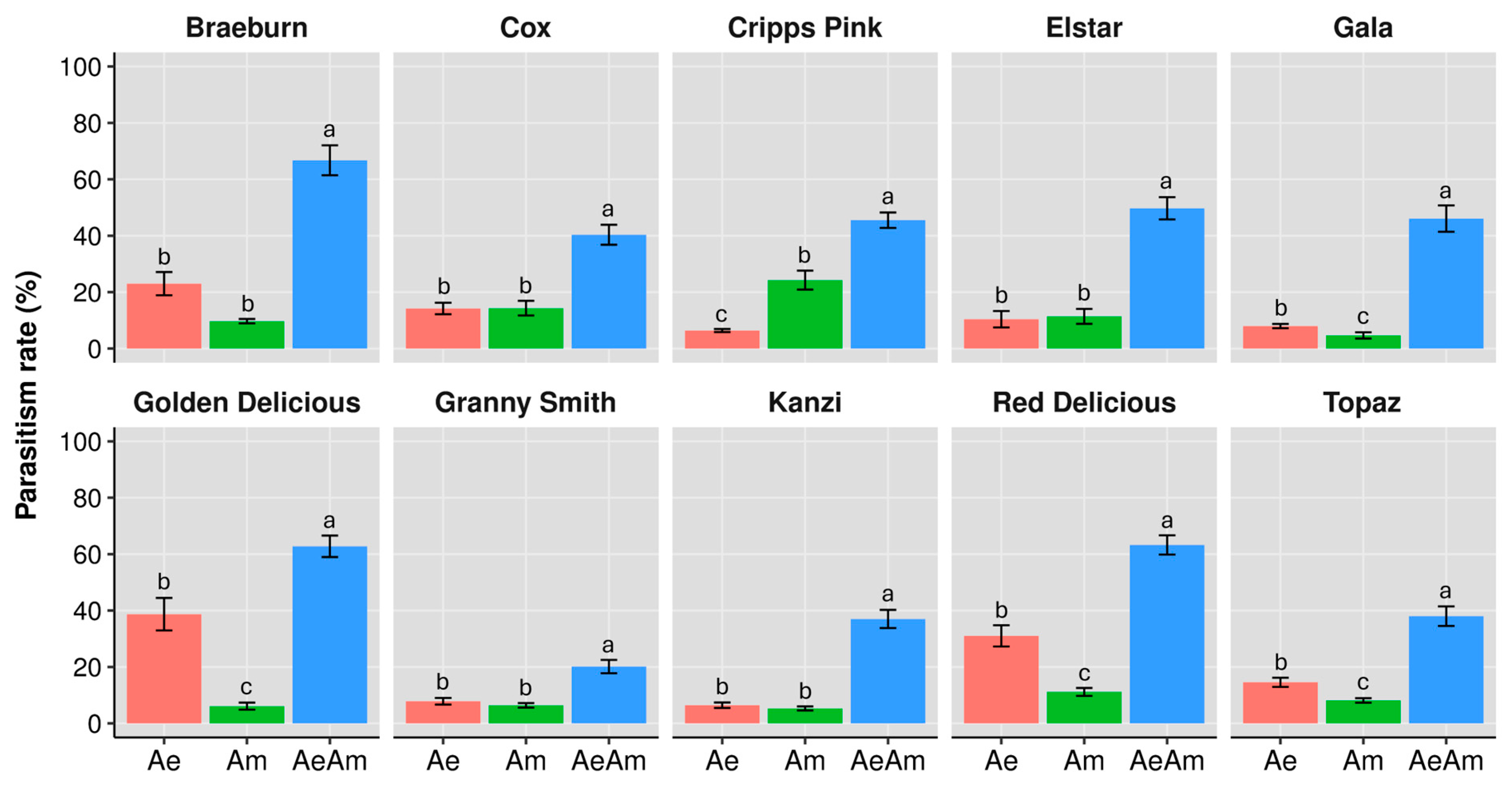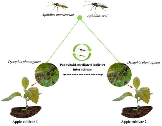 - Denoirjean, T.; Engels, C.; Le Goff, G.J.; Dubois, F.; Tougeron, K.; Doury, G.; Ameline, A.; Couty, A. Bottom-up Effects of Apple Cultivars on Parasitoids via Aphid Hosts. Arthropod-Plant Interact. 2024, 18, 181–192. [Google Scholar] [CrossRef]