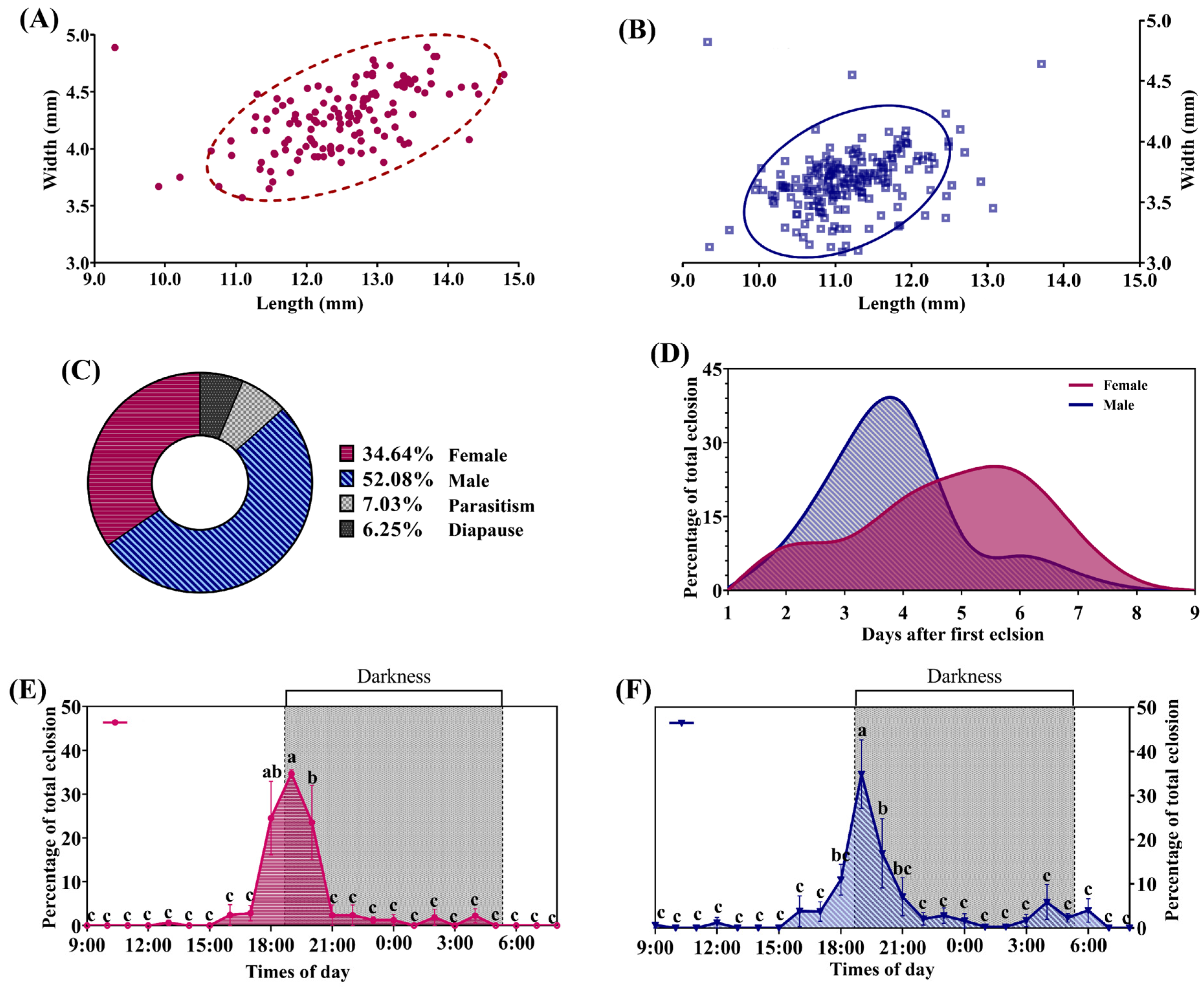 - Morris, M.C.; Takeda, S. The Adult Eclosion Rhythm in Hyphantria cunea (Lepidoptera: Arctiidae): Endogenous and Exogenous Light Effects. Biol. Rhythm Res. 1994, 25, 464–476. [Google Scholar] [CrossRef]