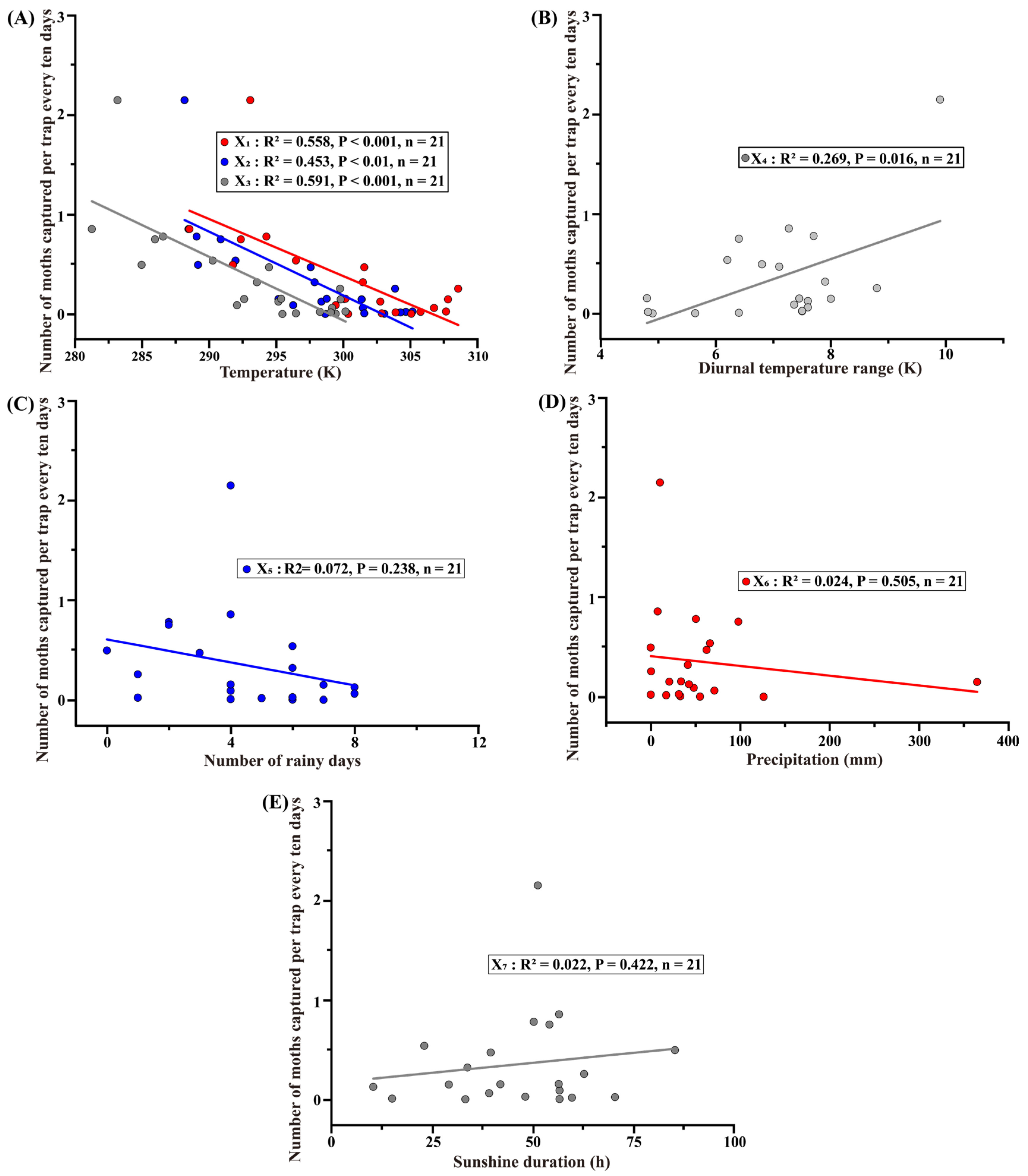 | Y | The numbers of moths captured per trap every 10 days | X3 | 10-day average minimum temperature | Y = −0.057X3 − 0.144X4 + 16.154 | R2 = 0.723 | F = 23.547 p < 0.001 | 1.048 |