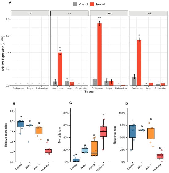 Relative expression of OR45a in the antennae, legs, and ovipositors of B. dorsalis exposed to cis-linalool oxide for 1, 5, 10, and 15 days post-eclosion (A). Asterisks indicate significant differences between control and cis-linalool oxide treatments (* p < 0.05; ** p < 0.001). Relative expression of OR45a after RNAi treatment in the 48 h after injection (B) and its effect on B. dorsalis mortality within 48 h after injection (C). Effect of RNAi on female response to cis-linalool oxide (D). Different lowercase letters indicate significant differences among treatments (Control, water, dsGFP, dsOR45a).