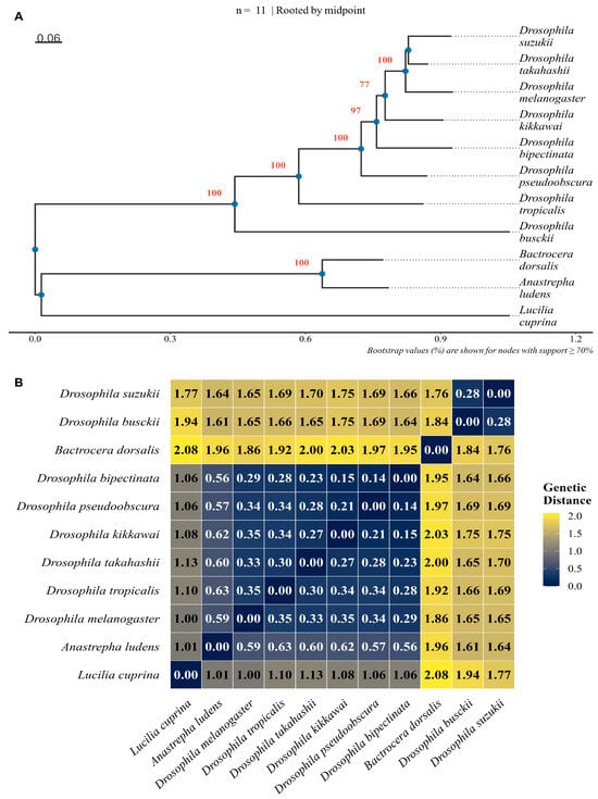(A) Phylogenetic tree of B. dorsalis OR45a together with OR45a orthologs from ten other Dipteran species. (B) Heatmap of pairwise genetic distances among these Dipteran species.