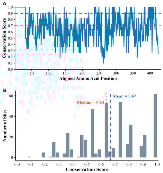 Among these sites, 84 (19.8%) were highly conserved (>90% identity), whereas 230 (54.2%) were variable (≤70% identity; Figure 3A). The mean and median conservation scores were 0.67 and 0.64, respectively (Figure 3B).