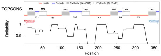 First, the secondary topology of the B. dorsalis OR45a protein was predicted using TopCons (https://topcons.cbr.su.se/, accessed on 20 September 2025), an integrated prediction platform that combines multiple algorithms (including OCTOPUS, Philius, PolyPhobius, etc.) to generate a consensus topology. It is commonly used for predicting GPCR and OR-type proteins, providing more robust results. These analyses identified transmembrane helices (TMs), along with intracellular loops (ILs) and extracellular loops (ELs) connecting them.