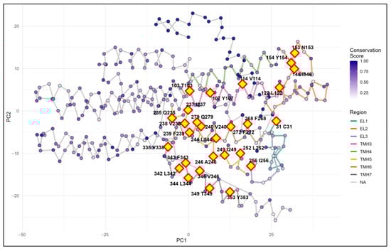 We combined this topology information with conservation scores derived from the multiple sequence alignment results obtained previously. Our focus was on extracellular loops and the termini of transmembrane segments, as these regions are most likely to form ligand-binding pockets located at TMH–EL junctions, which may be high-potential structural–functional regions. Each residue was classified based on whether it fell within these regions. Residues with a conservation score ≥0.9 located in these regions were designated as preliminary candidates. The threshold of 0.9 was chosen to ensure high confidence in conservation, consistent with previous studies.