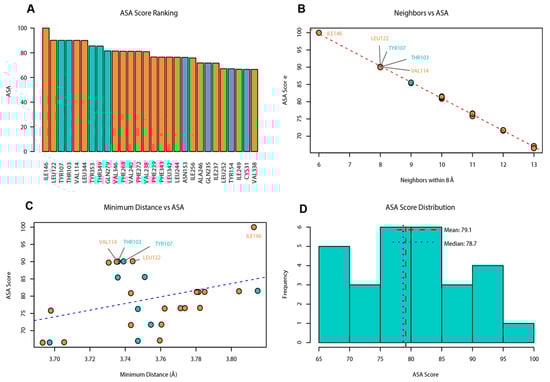 (A) ASA score ranking of 28 candidate residues. (B) Neighboring atoms of each residue within 8 Å. (C) Nearest-atom distance. (D) Distribution of ASA scores. The five residues with high ASA scores, fewer neighboring atoms, and shorter nearest-atom distances are highlighted in (B) and (C). Hydrophobic residues are shown in orange, and polar residues are shown in cyan.