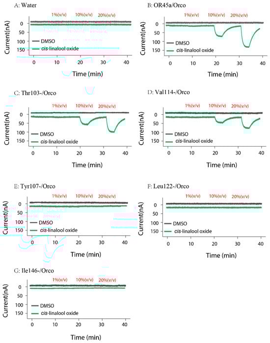 TEVC recordings of water-treated (A), wild-type (B), and five site-directed mutants (C–G) under three concentrations of cis-linalool oxide. DMSO (dimethyl sulfoxide) was used as the solvent control.