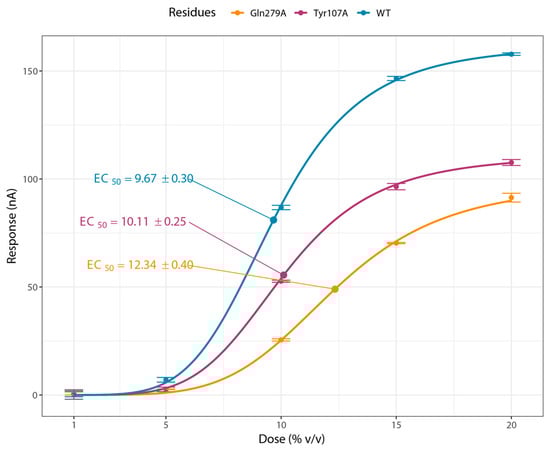 Western blot analysis (Figure S5A) and the corresponding band intensity ratios of each mutant protein (Figure S5B) showed that the relative abundances of different mutants differed significantly (one-way ANOVA, F = 44.49, df = 7, p < 0.001). The wild-type OR45a–ORco complex exhibited the highest level of expression, whereas Tyr107–ORco displayed significantly lower protein levels, comparable to those of the other mutant complexes. Both the Western blot and the quantitative intensity analysis indicated that Ile146, Leu122, Val114, and Thr103 were successfully expressed, although their relative levels were somewhat lower than that of the water-treated OR45a–ORco control. In contrast, Tyr107 showed no detectable expression. The functional roles of conserved residues were examined by TEVC recordings in X. laevis oocytes expressing wild-type OR45a/Orco or point mutants (Thr103, Tyr107, Val114, Leu122, Ile146). No currents were detected in water-injected oocytes (Figure 7A). Stimulation with cis-linalool oxide (1, 10, 20% v/v) evoked robust, concentration-dependent inward currents in the wild type at 10% and 20% (Figure 7B). Mutants Thr103 (Figure 7C) and Val114 (Figure 7D) retained partial responses but showed reduced maximal currents compared with the wild type. In contrast, Tyr107, Leu122, and Ile146 failed to elicit significant responses compared with the DMSO control (Figure 7E–G). Dose–response analysis yielded Imax values of 142 ± 19 nA for the wild type, 111 ± 9 nA for Thr103, and 98 ± 10 nA for Val114. EC50 estimates were 9.67 ± 0.30 μL/mL for the wild type, 12.34 ± 0.40 μL/mL for Thr103, and 10.11 ± 0.25 μL/mL for Val114 (Figure 8).