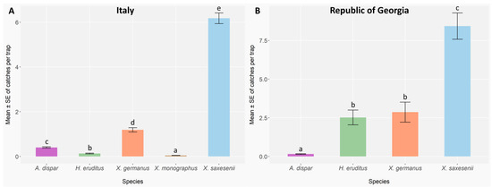 In Italy, the abundances of bark and ambrosia beetle species were statistically different (GLMER; A. dispar: Z = −4.76, p < 0.001; H. eruditus: Z = −14.70, p < 0.001; X. germanus: Z = 14.43, p < 0.001; X. monographus: Z = −20.21, p < 0.001; X. saxesenii: Z = 44.00, p < 0.001) (Appendix B, Table A2 and Table A3). The most and the least abundant species were X. saxesenii and X. monographus (Figure 4A), which have reported the highest and the lowest mean catches per trap, respectively. Conversely, in the Republic of Georgia statistical differences were observed among all the species (GLMER; A. dispar: Z = −8.60, p < 0.001; H. eruditus: Z = 16.36, p < 0.001; X. germanus: Z = 16.37, p < 0.001; X. saxesenii: Z = 19.21, p < 0.001) (Appendix B, Table A4), except between X. germanus and H. eruditus (X. germanus vs. H. eruditus: p = 0.67) (Appendix B, Table A5). Xyleborinus saxesenii and A. dispar were the most and the least abundant species, respectively (Figure 4B).