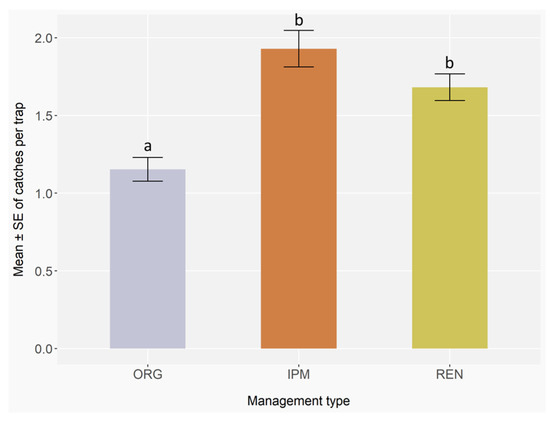 Residual diagnostics indicated no overdispersion (dispersion = 0.95, p = 0.77), uniform distribution of residuals (Kolmogorov–Smirnov test, D = 0.01, p = 0.15), and negligible zero inflation (ratio = 0.99, p = 0.60), supporting an adequate fit of the negative binomial GLMER. The phytosanitary management strategies significantly affected the occurrence of bark and ambrosia beetles (GLMER; ORG: Z = −1.39, p = 0.17; IPM: Z = 2.39, p < 0.05; REN: Z = 2.12, p < 0.05), with IPM and REN showing higher values than ORG (Appendix C, Table A6), as also indicated by Post hoc pairwise comparisons with Benjamini–Hochberg correction, which revealed marginal differences between ORG and IPM (p = 0.05) and between ORG and REN (p = 0.05). No significant difference was observed between IPM and REN management (p = 0.77) (Figure 5) (Appendix C, Table A7).
