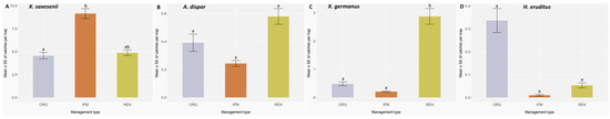 Mean number ± standard error (error bars) for each ambrosia or bark beetle species captured under different phytosanitary management regimes: (A) Xyleborinus saxesenii; (B) Anisandrus dispar; (C) Xylosandrus germanus; (D) Hypothenemus eruditus. Different letters indicate statistically significant differences between management types based on the Benjamini–Hochberg test (p < 0.05).