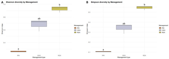 Boxplot of Shannon (A) and Simpson diversity (B) of ambrosia and bark beetle communities across three management types (ORG, IPM, REN). Boxes represent the interquartile range (IQR), horizontal lines indicate the median, and whiskers extend to 1.5 × IQR. Different letters indicate statistically significant differences between management types, based onKruskal–Wallis and Dunn’s Post hoc tests with Benjamini–Hochberg correction (p < 0.05).