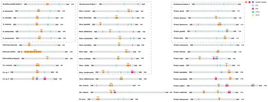 Structural features of mitochondrial control regions in Corydalinae. The locations and copy numbers of tandem repeats are represented in purple, pink, and orange. Blue boxes represent T tandem repeat units. Red boxes represent A tandem repeat units. Green boxes represent TA tandem repeat units. Yellow boxes represent AT tandem repeat units. Species in the same dashed box possess imaginative features.