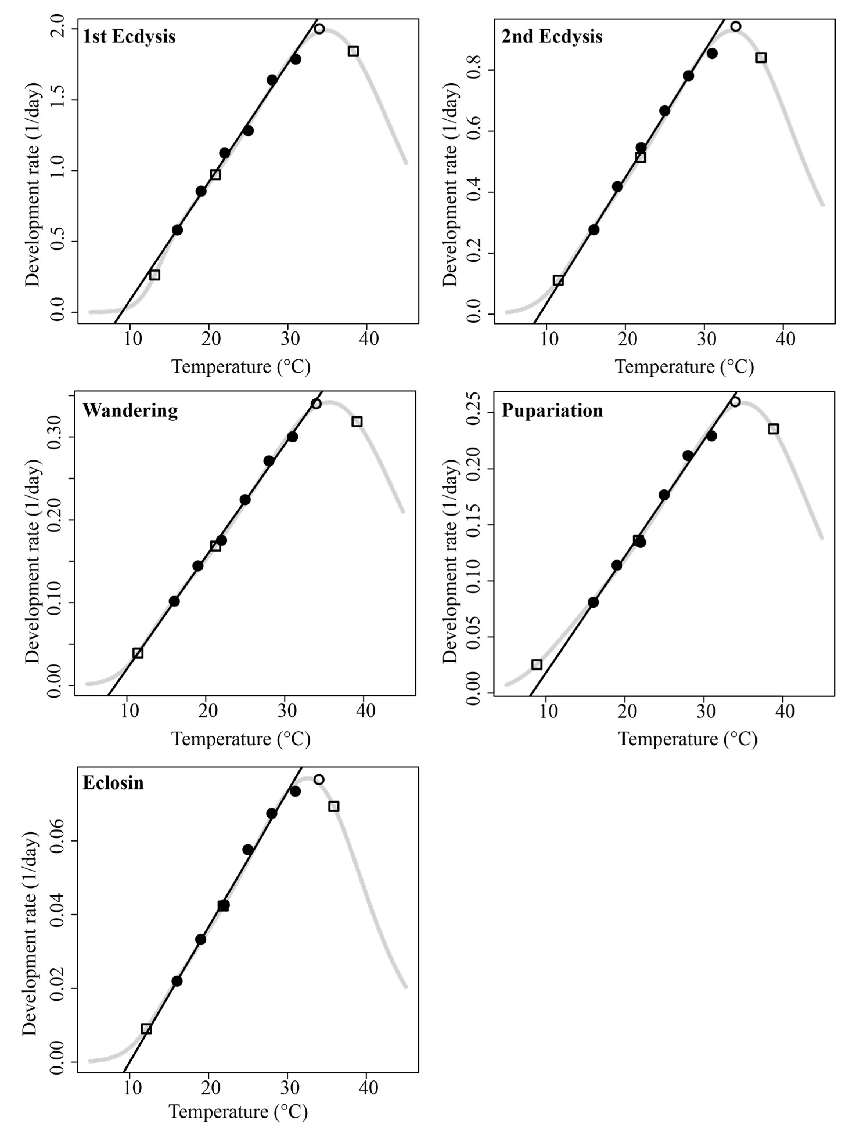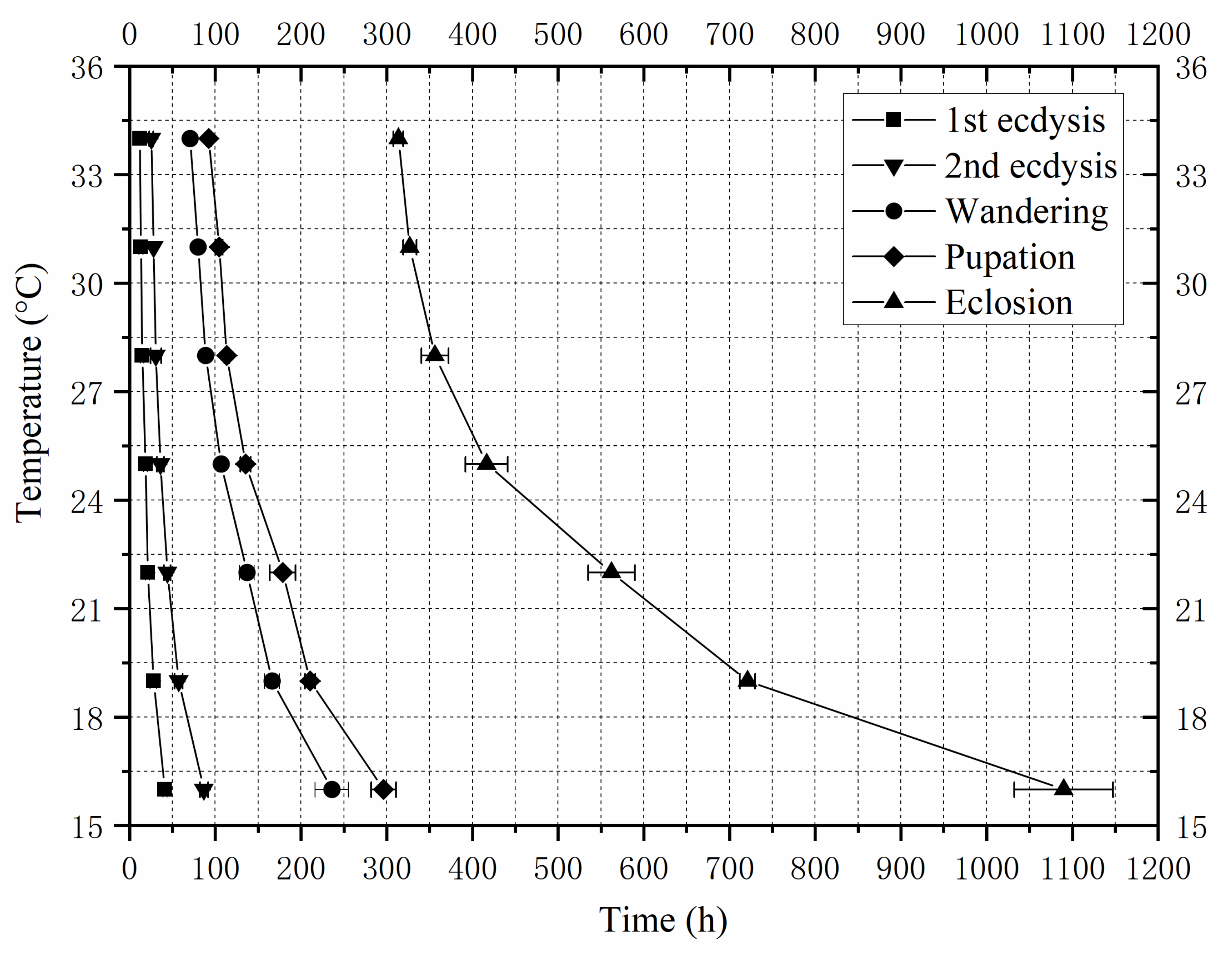 | Temperatures | First Ecdysis | Second Ecdysis | Wandering | Pupariation | Eclosion |