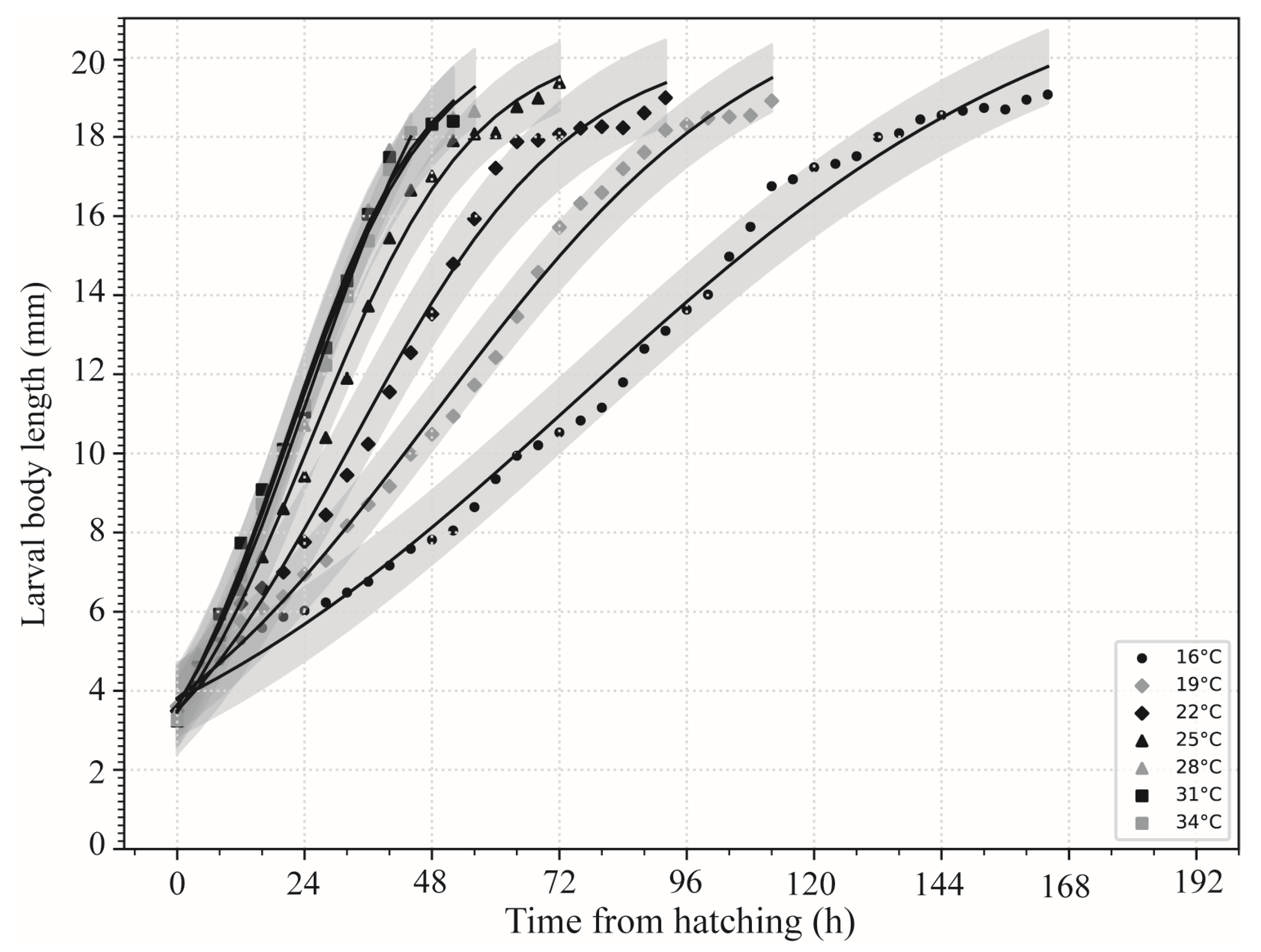 3.3. Larval Body Length Variation and Isomegalen Diagram