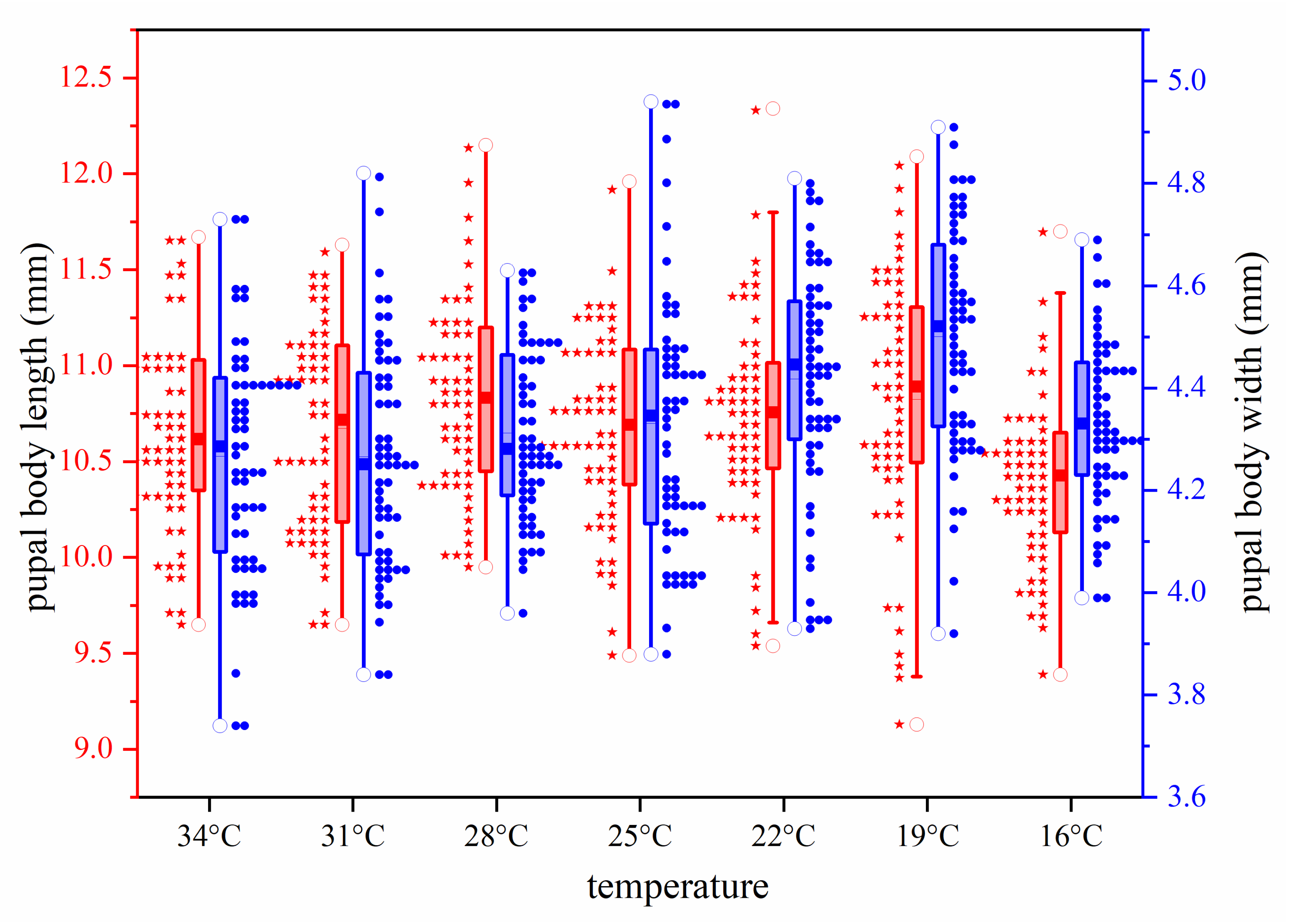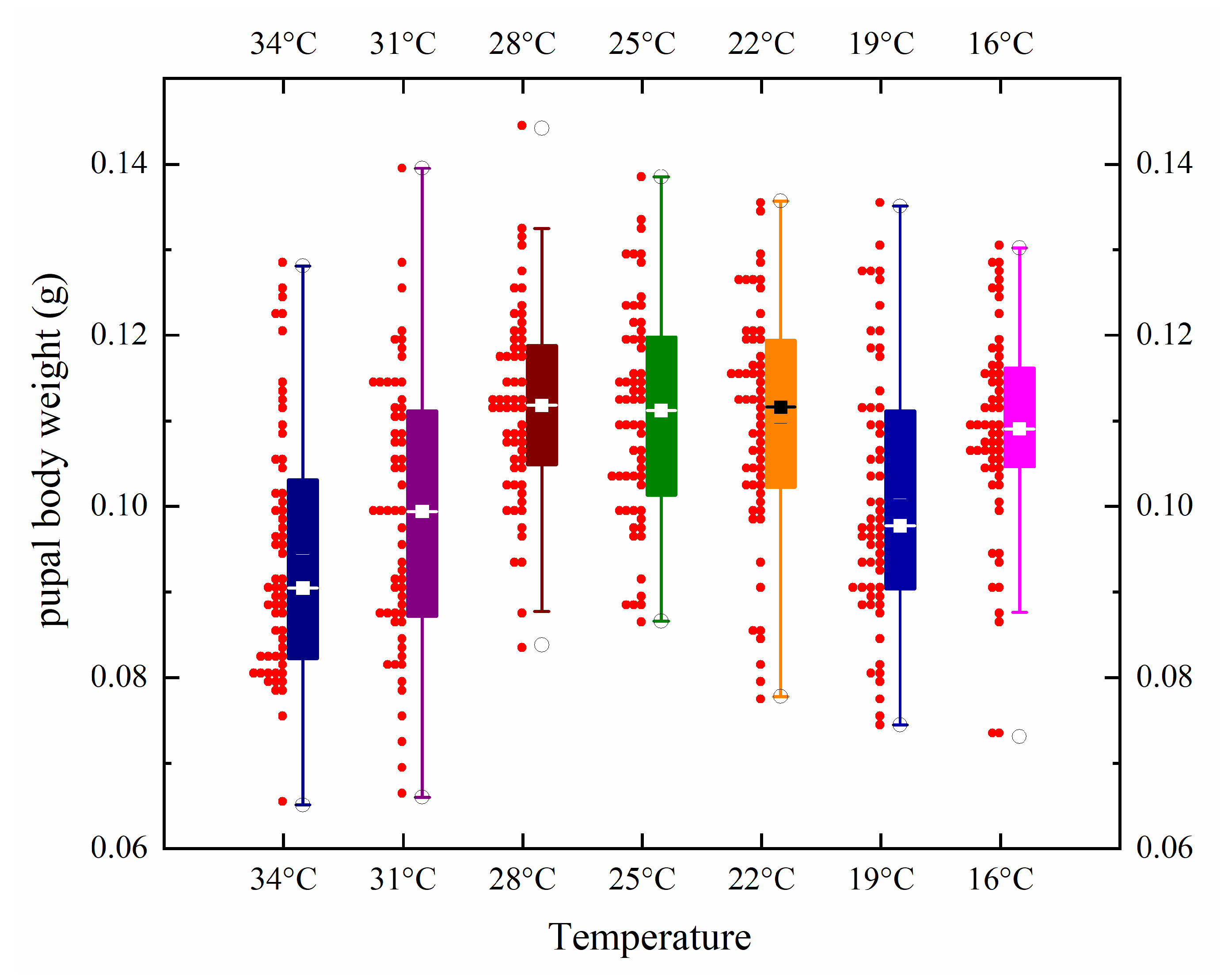 | Temperatures | Pupal Body Weight (g) | Pupal Body Length (mm) | Pupal Body Width (mm) | ||||||
